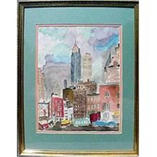 American landscape painting of Midtown New York City skyline with Empire State Building and Wrigley Tower skyscrapers. A very nostalgic original watercolor painting (NOT a print) by woman artist Rosannah Guilmette (1904-1987), signed and dated 1960. Note wonderful old cars in this cityscape painted with exuberant energy. Photos taken under glass are hazy, do not do justice to it. Guilmette was a student of the famous Raphael Soyer and follows his modernistic style. Art by American women painters is increasingly in demand. Original perfect condition, 16x20 inches. Matted and framed, 24x30 inches. (Selling separately, other watercolors by this artist are available, please inquire.)