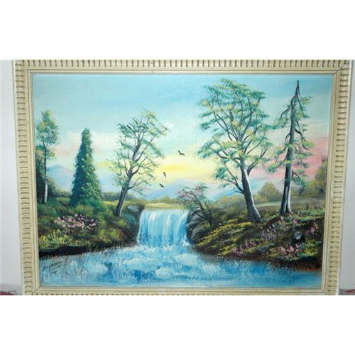Lovely vintage painting by a local artist Clyde R. Anderson. It is an inviting scene of a waterfall and trees with a lush medow that with a mountain back drop. <p> I don't know if this an oil or an acylic. I am not very savvy about paintings. It has too much texture for a water color. It is dedicated on the back and reads "Hazel: I hope you like this painting. It is one of my best. Love, Clyde R. Anderson". How sweet!. It is a pleasing and very well done scenic painting. <p> The measurement of the painint inside the frame is : 15 3/4" x 11 7/8" and measurement that includes the outer side of the frame is : 17 1/2" x 13 5/8". It is not behind glass and it appears that it never was. <p> The condition of the painting is excellent. The paint of the wood frame looks a bit aged.