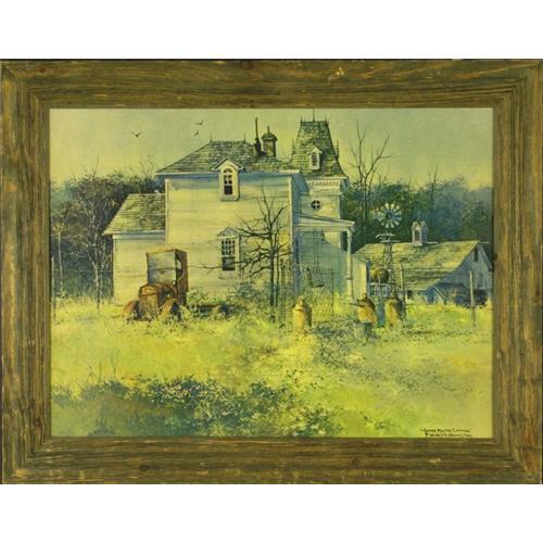 Hamilton brilliantly captures this delightful old run-down farm house in his skillfully conceived and realistic print entitled ?Gone for the summer?. His mastery of brushwork brings the vibrant life to this image. The old house with all the over grown bush is done in vivid detail. The incredible realism in the foreground plays with the viewer?s imagination. This very masterfully painted piece is complimented by a brown wood frame that looks like old fencing that has seen the elements and brings life to the picture. The framed painting measures a total of 22?x 28?. Signed in the bottom right corner, this painting would be a great addition to any art enthusiast?s collection and is remarkably priced.
