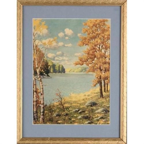 ?Near Lakefield? is the title of this realistic autumn study in the Kawartha Lakes region north of Peterboro, Ont. It is by W. Blackwood, and is one more proof of the skill with which the painters of Canada depict the Canadian landscape, particularly in the season of falling leaves. The color reproduction does full justice to the artist?s judicious blending of pigment, without garish exaggeration. He has captured the season?s subtle, subdued mood all the more impressively because of his restraint. The print is framed in a gold decorative wood frame and matted in a bluish gray mat, the total size of frame and print is 17.25? x13.25.