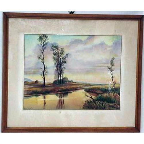 A framed watercolor, 21 1/2" X 25 1/2", Landscape scene of tall trees and reflective water. Signed lower left "David Mackoff 39"