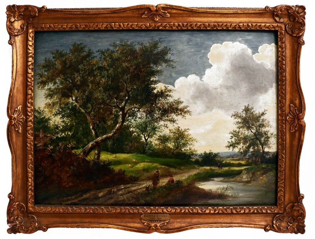 Attributed to James Stark but probably based on Meindert Hobbema, Dutch. Oil on board 15.5" x 20". Frame measures 19" x 24"