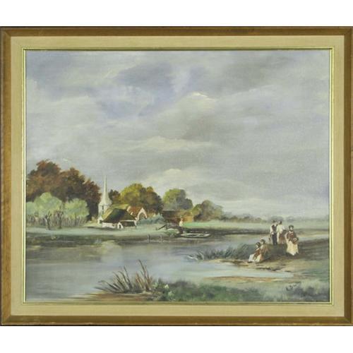 Original oil on canvas landscape painting entitled ?Landscape and People?, painted by E Deiton