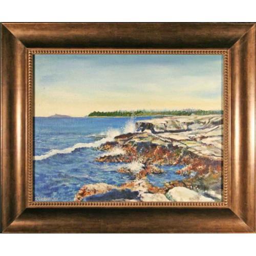The cool, blue rushing water can be seen in ?Shoreline?, this delightfully and expertly rendered oil painting. The artist masterfully captures the waves as they hit upon the rock and the clear sky in the background, ...