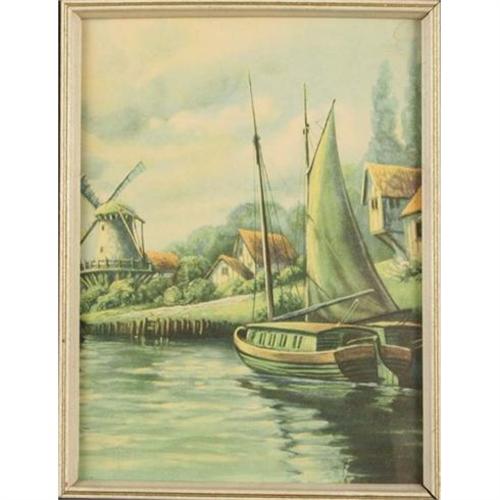 This is a lovely painting of a Dutch village along the river, which is in very good condition and shows in crisp clarity the many details that the original artist so meticulously rendered. This painting is perfectly framed in a white wood frame edged with gold that makes the entire picture come to life. The bright colors seem to jump out of this 12.5? x 9.55? painting.