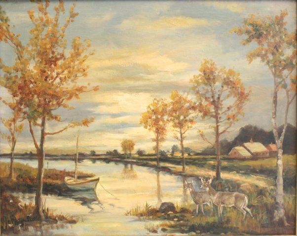 Gilt framed. "Boat, Deer by Waterside". Signed lower right, early-mid 20th c. Approx. 25" x 30". Please read our terms of sale.
