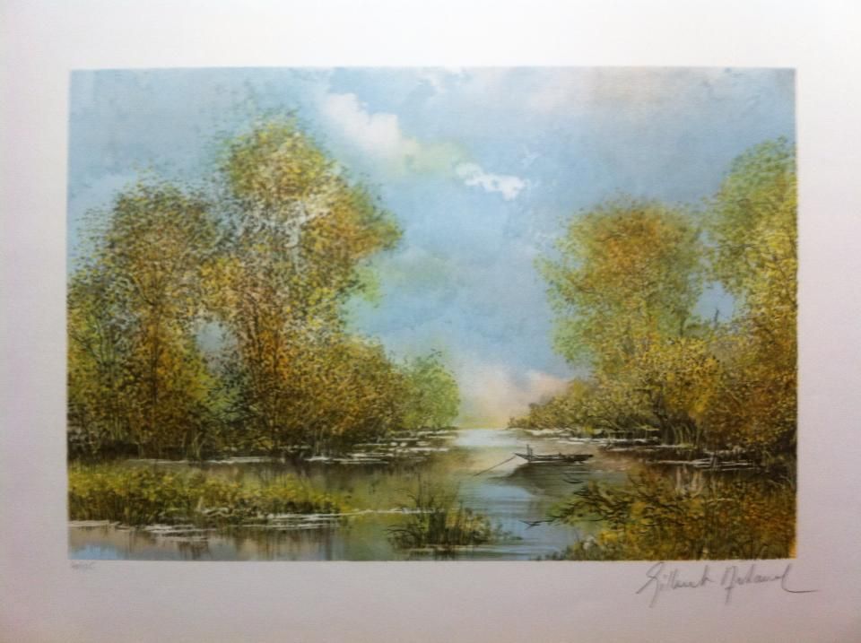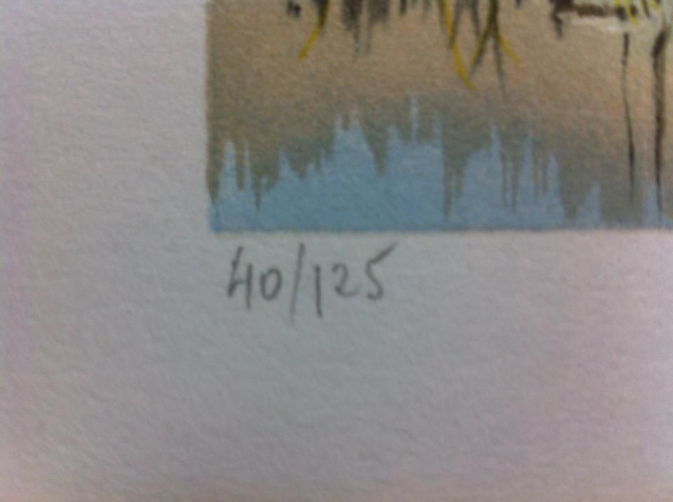 Numbered 40/125 This beautiful print is hand signed overall 18 1/2" x 26" image size 12 1/2" x 18 1/2" This is a lithograph of a watercolor painting that features the landscape of a pond, and the surrounding trees and sky, that are further reflected across the stillness of the water of the pond.