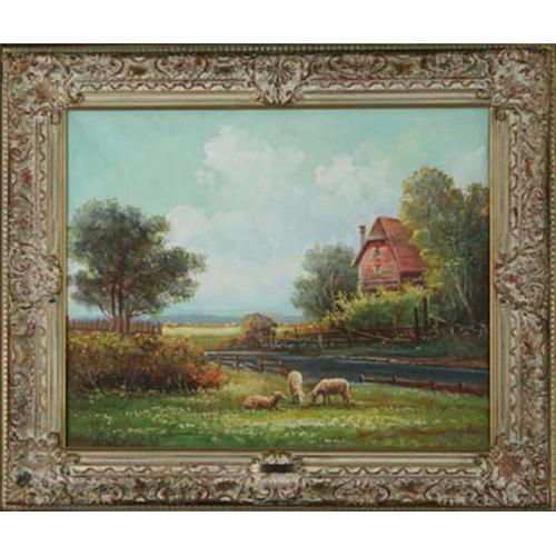 Great painting of a rural American farm. Complete with a red barn and sheep. Beautiful flora and a richly painted sky enchance the composition. Framed in a wonderful ornate carved gold frame with white accents. Edwin Henry is an American landscape and portrair artist lived in the 20th century known for his oil paintings. The Painting is 16'x 20'. Henry Edwin Painting Seaated Nude( Oil painting) was sold by John Moran - Pasadena, CA, USA 21- October-1997 for 1200.00 US$.