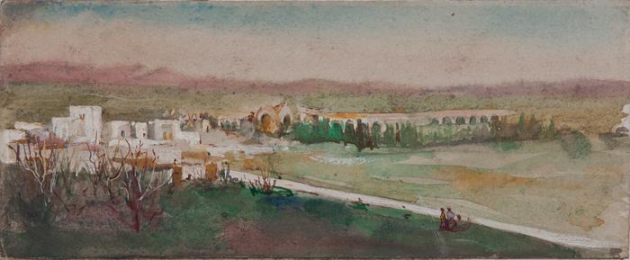 Hilda May Gordon (1874-1972). British archaeologist and painter. Studied under Frank Brangwyn and Sir Hubert von Herkomer at the Bushy School of Art and joined Brangwyn on a painting trip to Italy in 1900. A significant part of her paintings consists of tens of aquarelles painted in Palestine around the year 1900. Although inspired by the Orientalist academic trend, some individual shades can be traced in Hilda May Gordon's small paintings, in particular her tendency towards the light cloudy shade, and her remote view which is always one of a curious but cautious tourist.She set off travelling for a few months in 1922 and ended up going on a trip around the world, which lasted six years. During this time she visited India, Kashmir, Tibet, Burma, Thailand, Indonesia, China and Japan and produced a large body of watercolour paintings - the product of her keen ability to render people and the atmosphere of exotic places in colourful compositions.