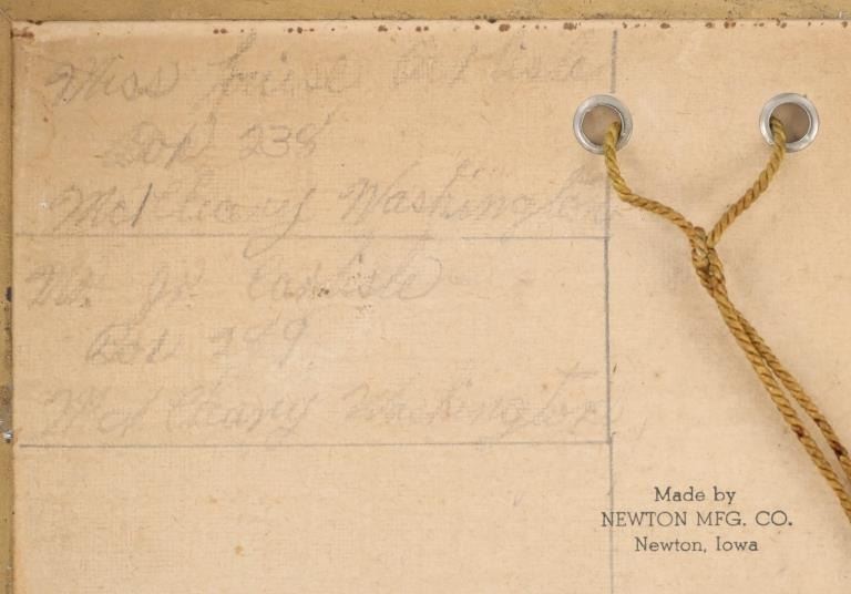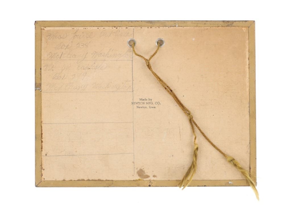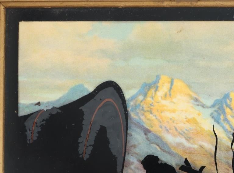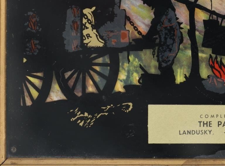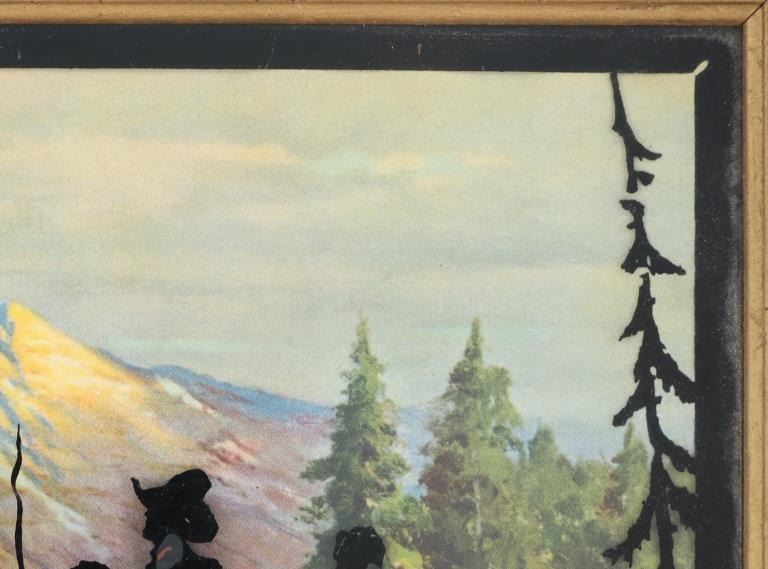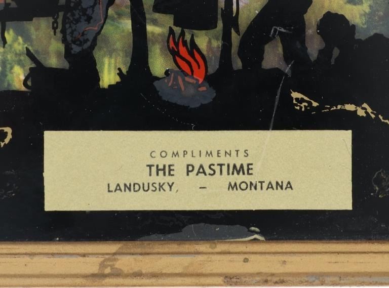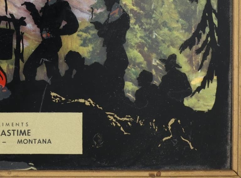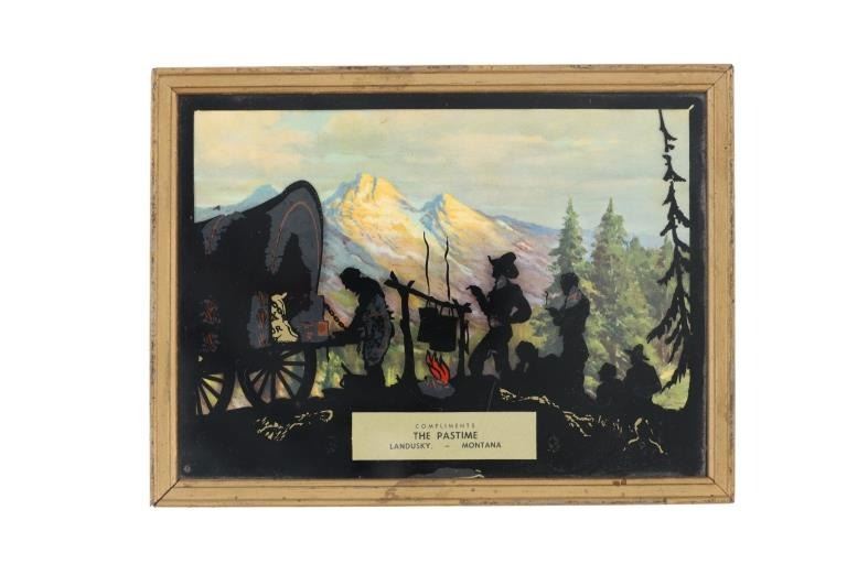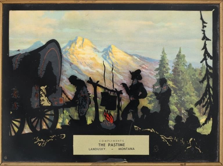 Featured in this lot is this Landusky, Montana "The Pastime" Silhouette litho. The artwork shows a landscape of a mountain peak in the background and in the foreground the silhouette of a morning campfire and cooking of grub. The artwork is marked as follows: Compliments - The Pastime - Landusky - Montana. The condition of this silhouette landscape lithograph is good with some slight wear to the frame but otherwise shows a good overall condition. The measurements of this framed artwork is 6 1/8" x 8 1/8" and the visible artwork measures 5 3/8" x 7 3/8". The collective weight of this artwork is U4oz.