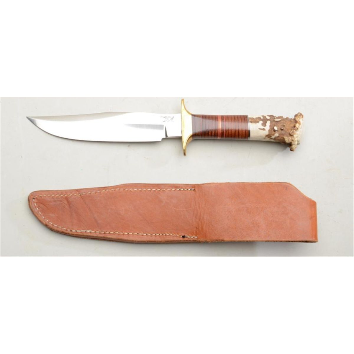 Laner Custom Knives made modern clip point bowie style knife approx. 13” overall with an approx. 7” blade, custom made leather disc and staghorn grip, simple brass cross guard in excellent condition showing littlehandling with fine tan leather sheath. Est.: $150-$300.