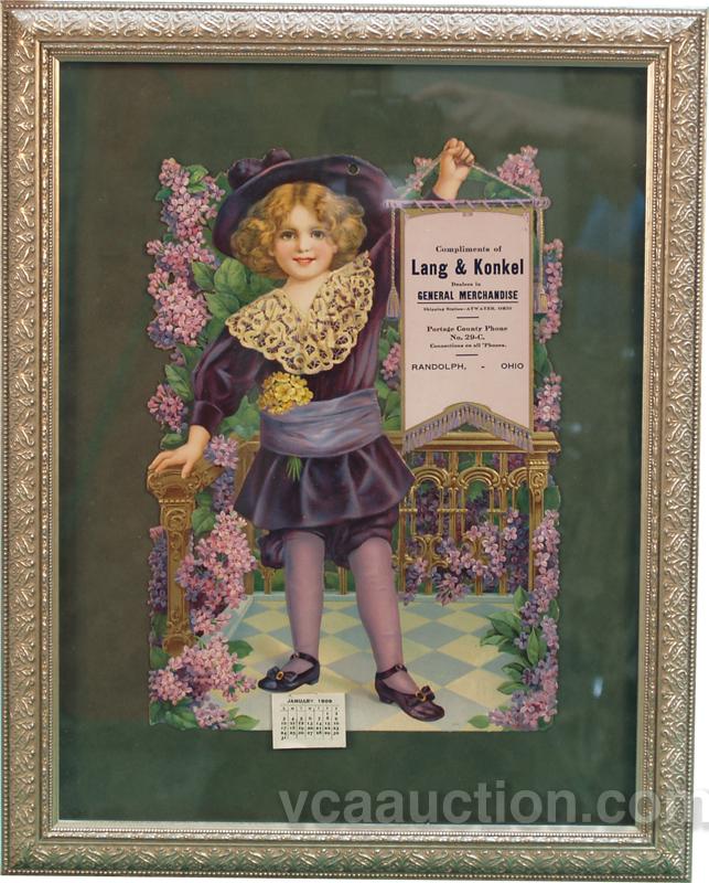 Lang & Konkel Dealer's In General Merchandise Die-Cut Cardboard Advertisement w/ 1909 Date Pad, In Frame - 15" x 20" Print - 9" x 13"