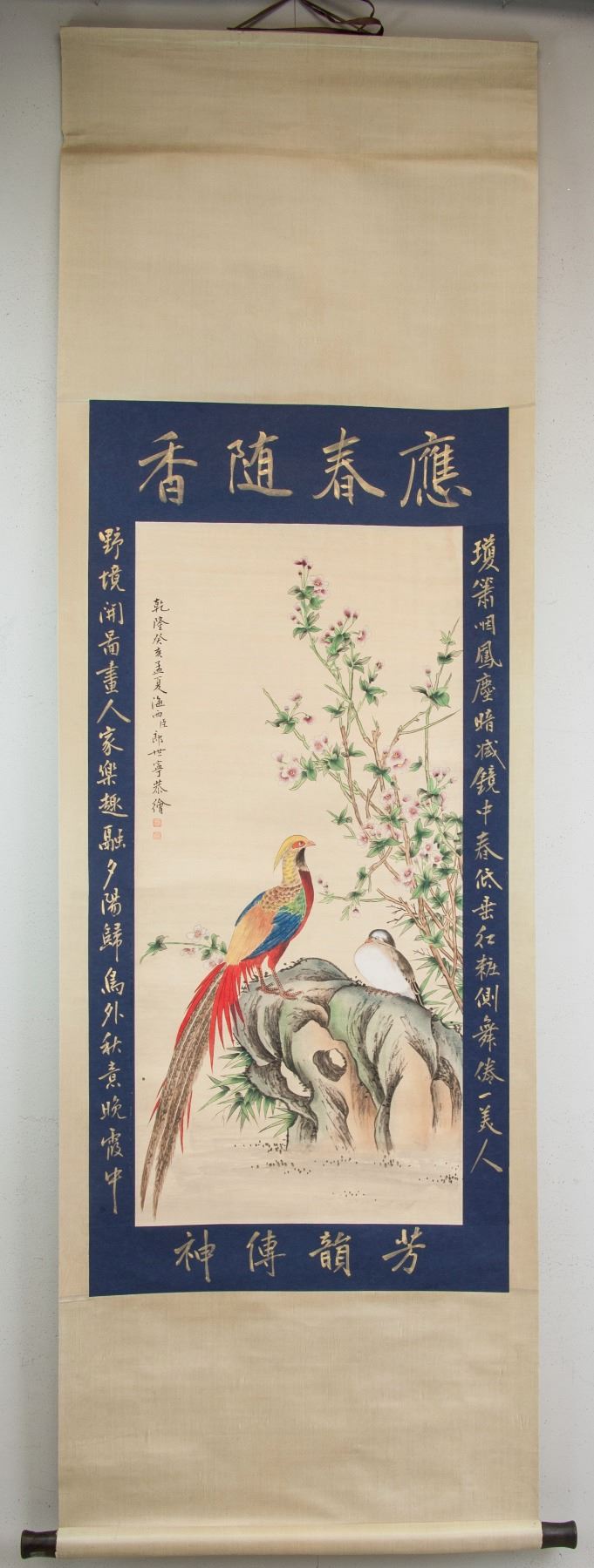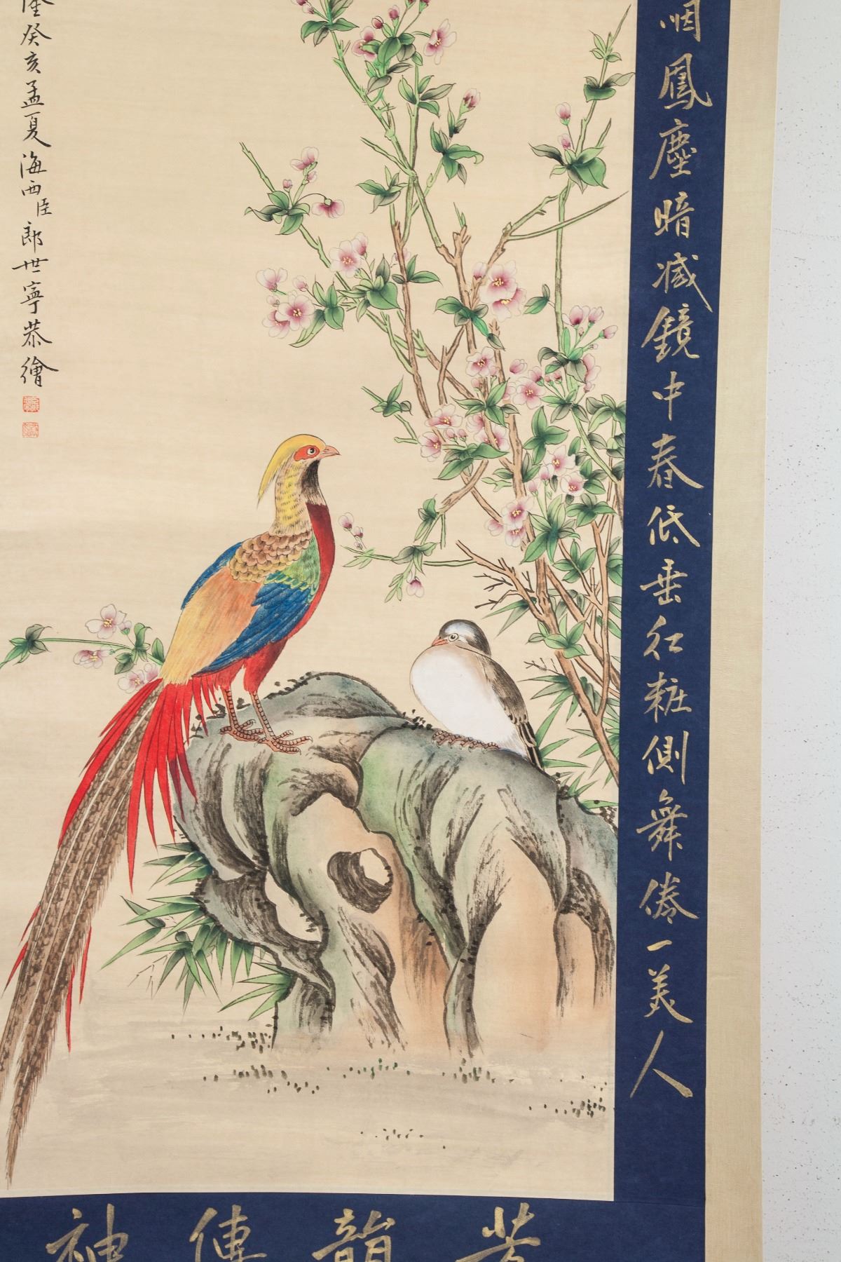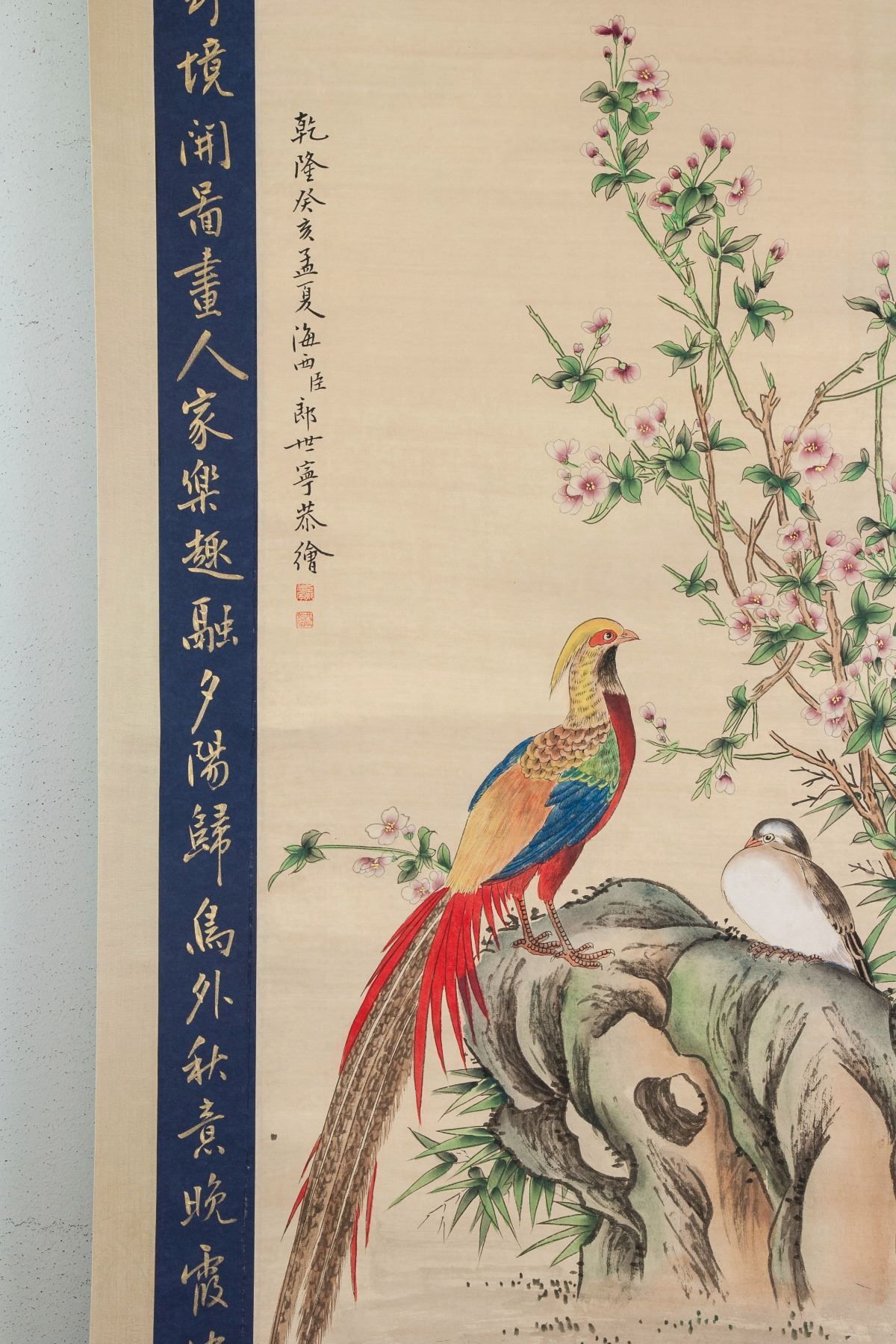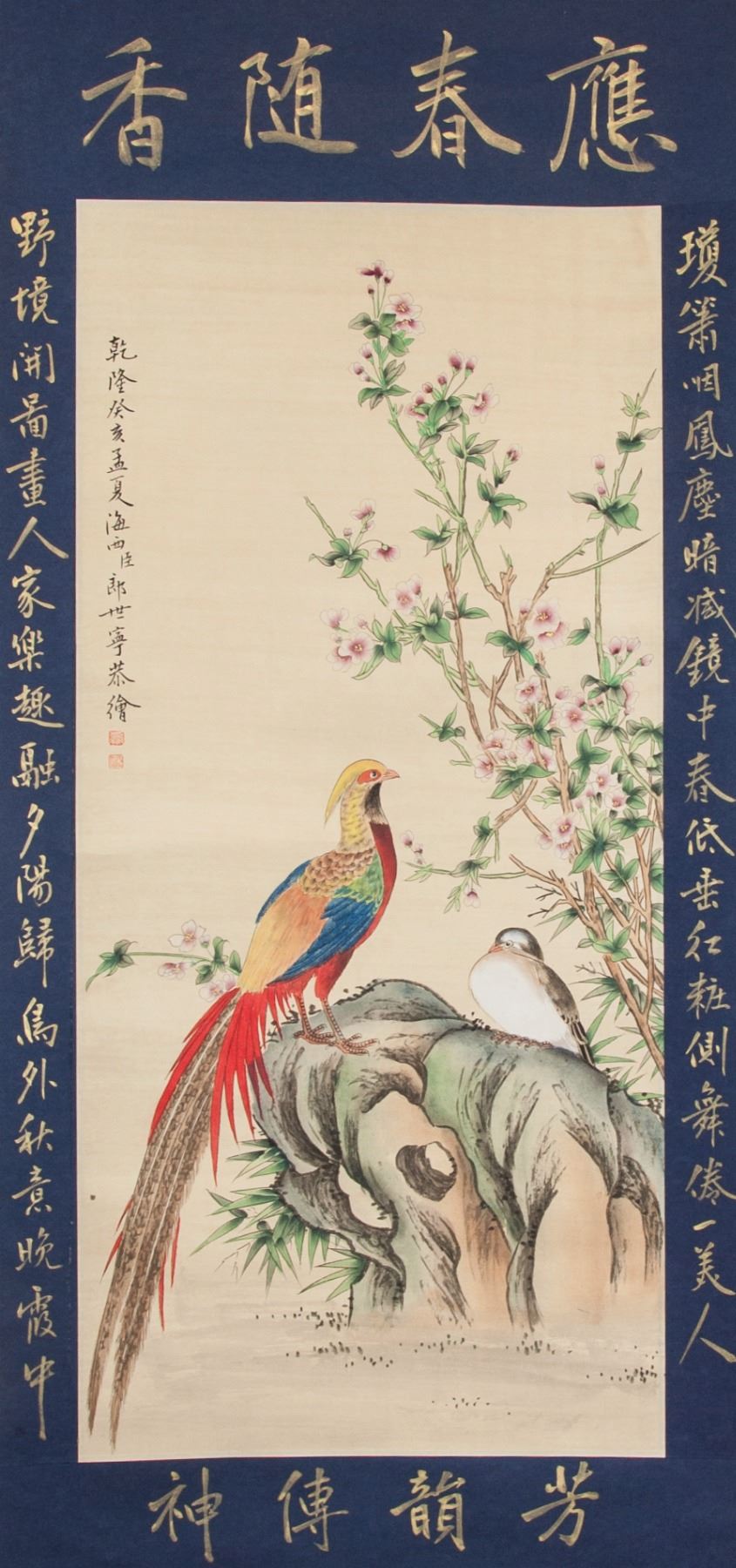 Painting of pheasant with Chinese calligraphy in regular script; Chinese ink and watercolour on paper; hanging scroll; signed Lang Shining (1688-1766); inscribed with 2 artist seals; 114 cm x 54 cm