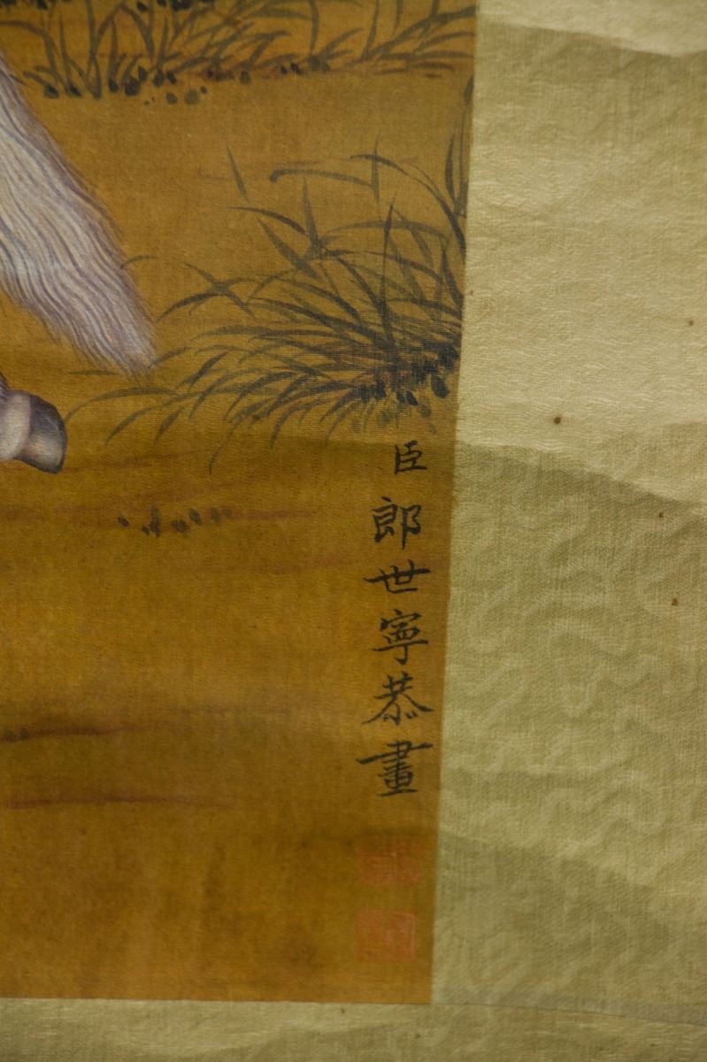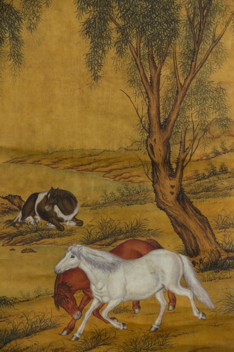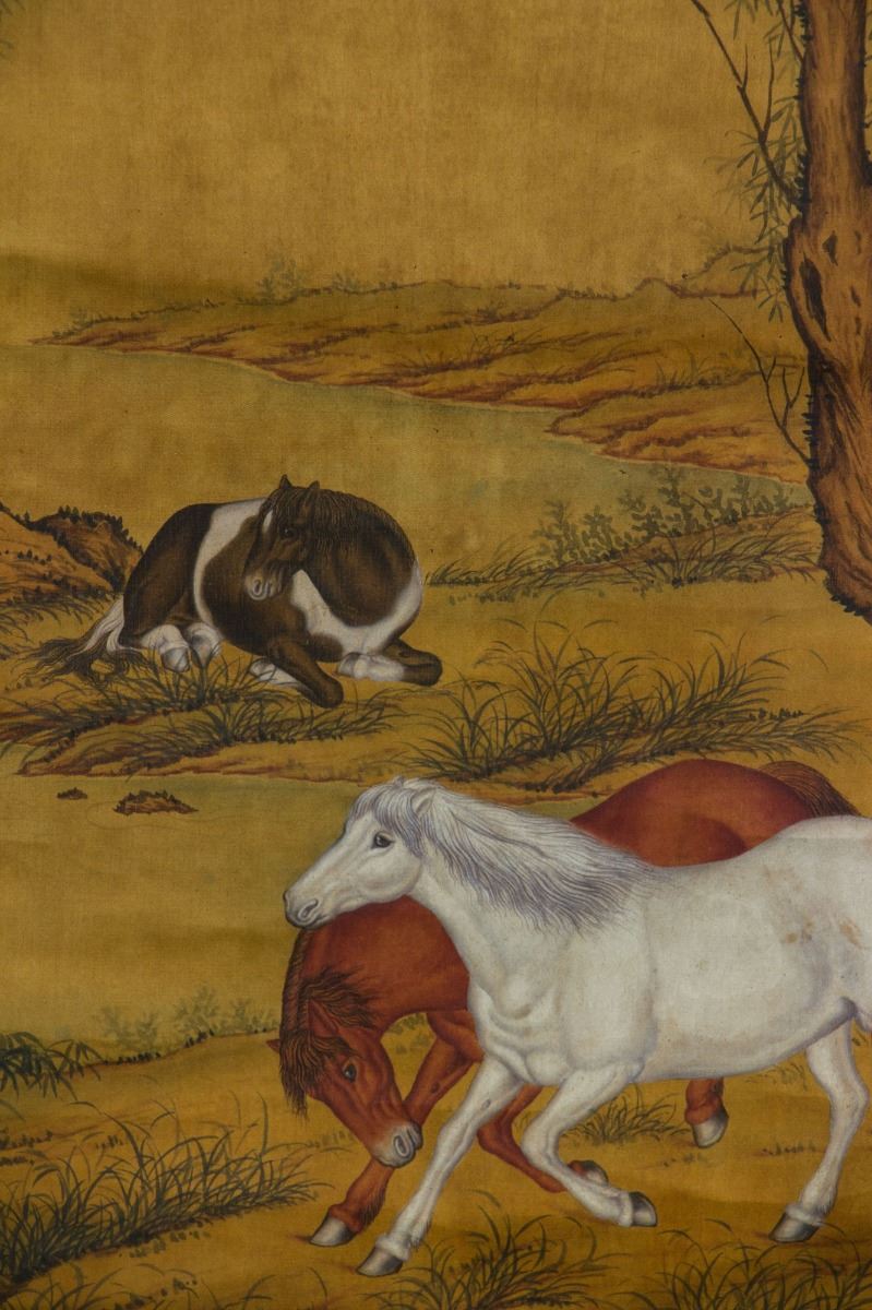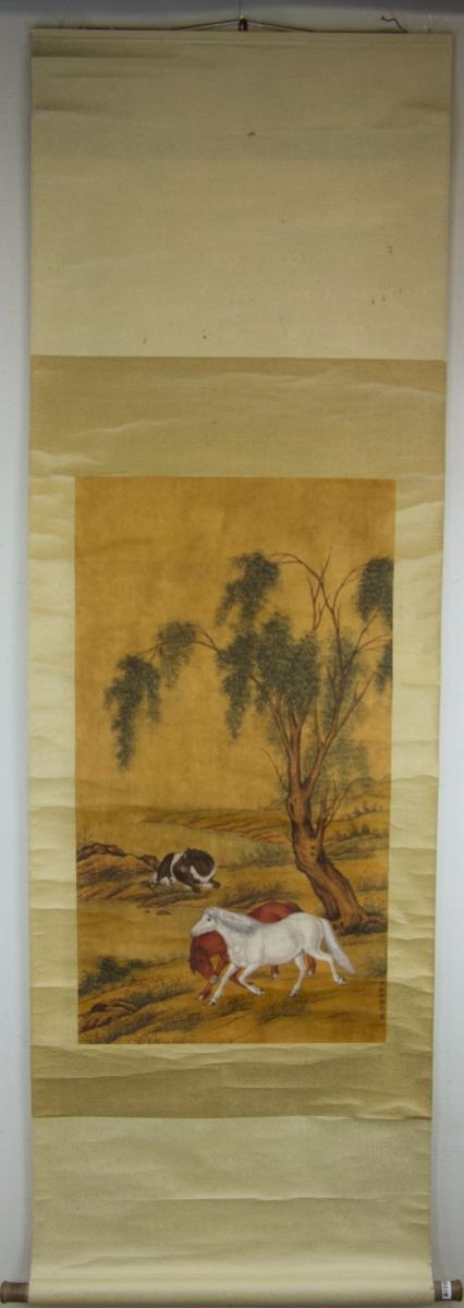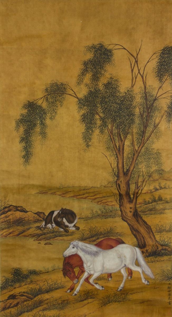 Three horses on ground, two galloping and one crouching; Chinese ink and watercolour on paper; hanging scroll; signed Lang Shining (1688-1766); inscribed with two artist seals; 190 cm × 60 cm