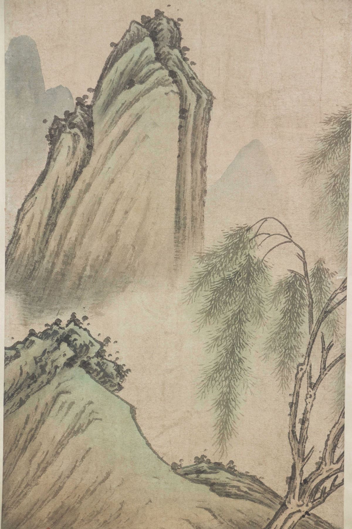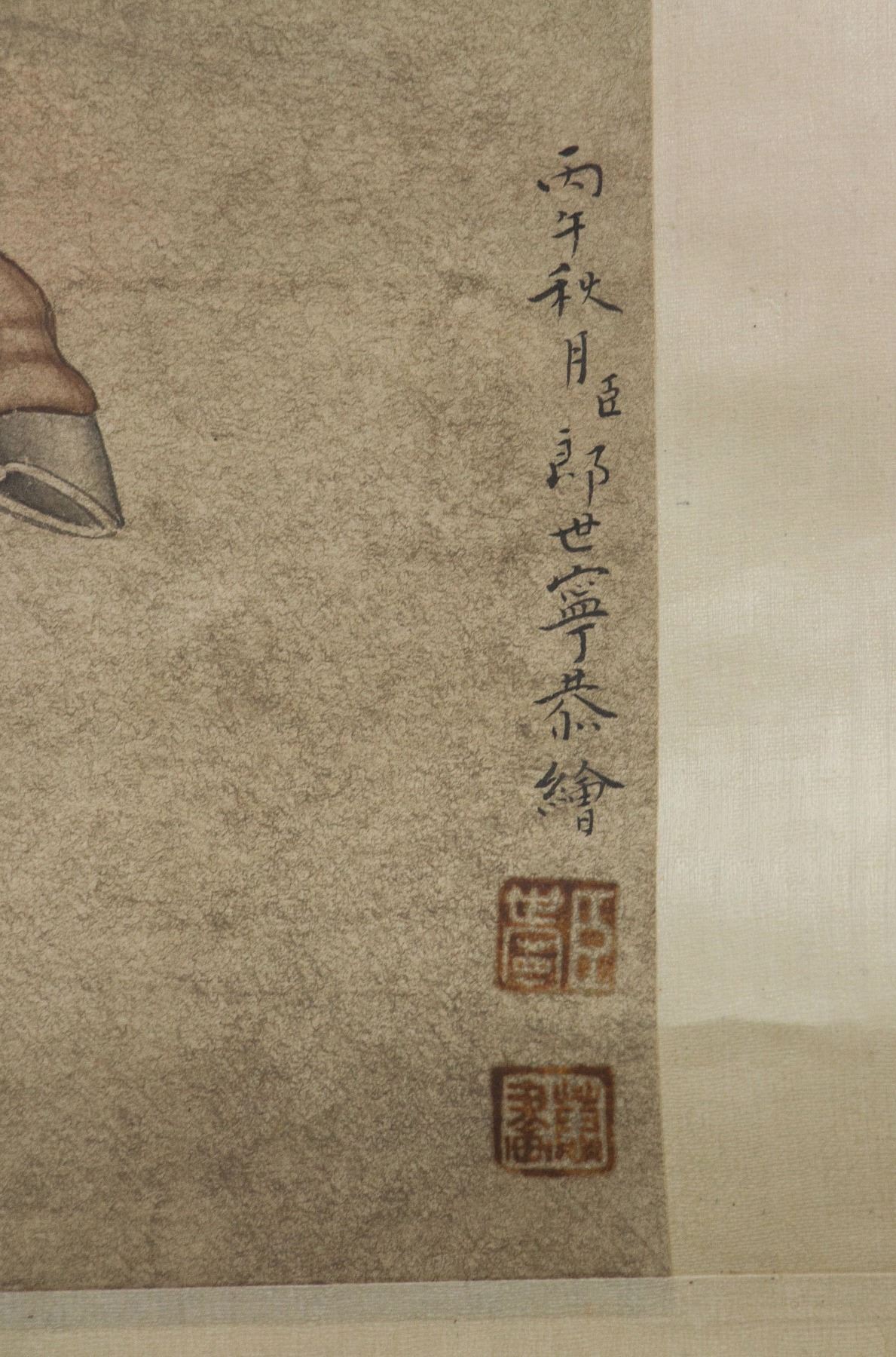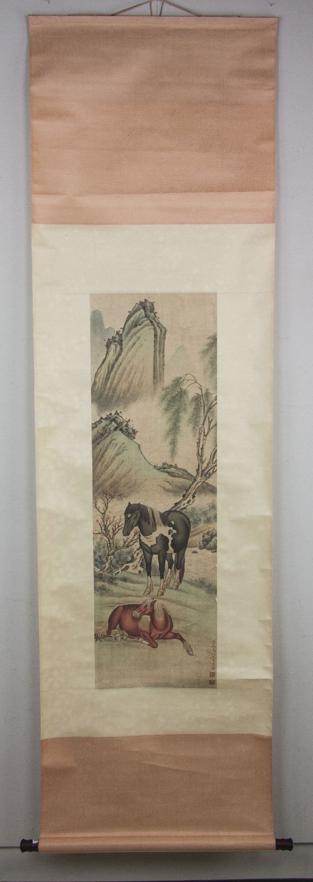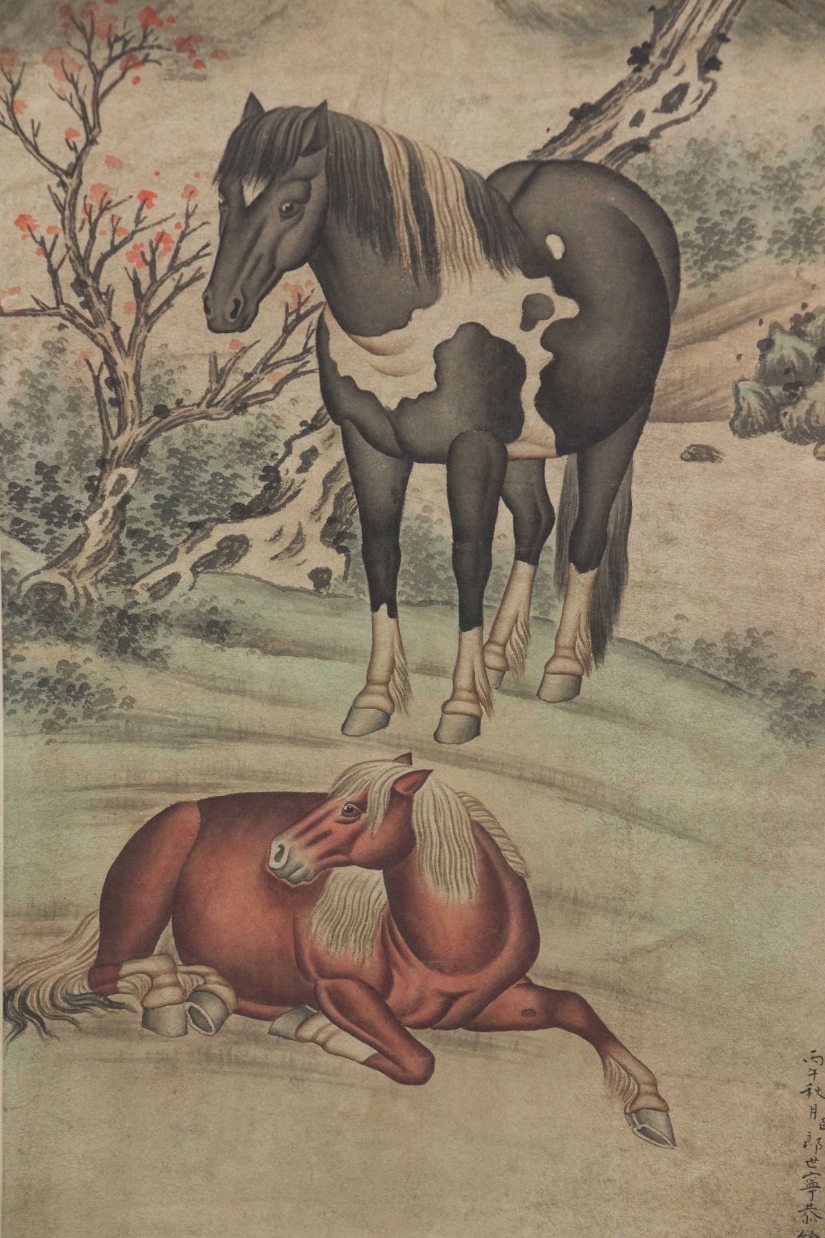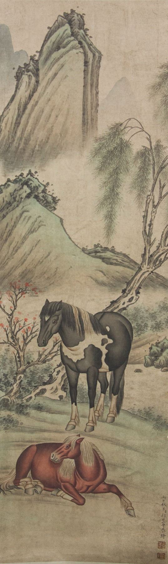 Two good breed horses and mountainous landscape; Chinese ink and watercolour on paper; hanging scroll; signed Lang Shining (1688-1766); inscribed with 2 artist seals; 98 cm x 31 cm