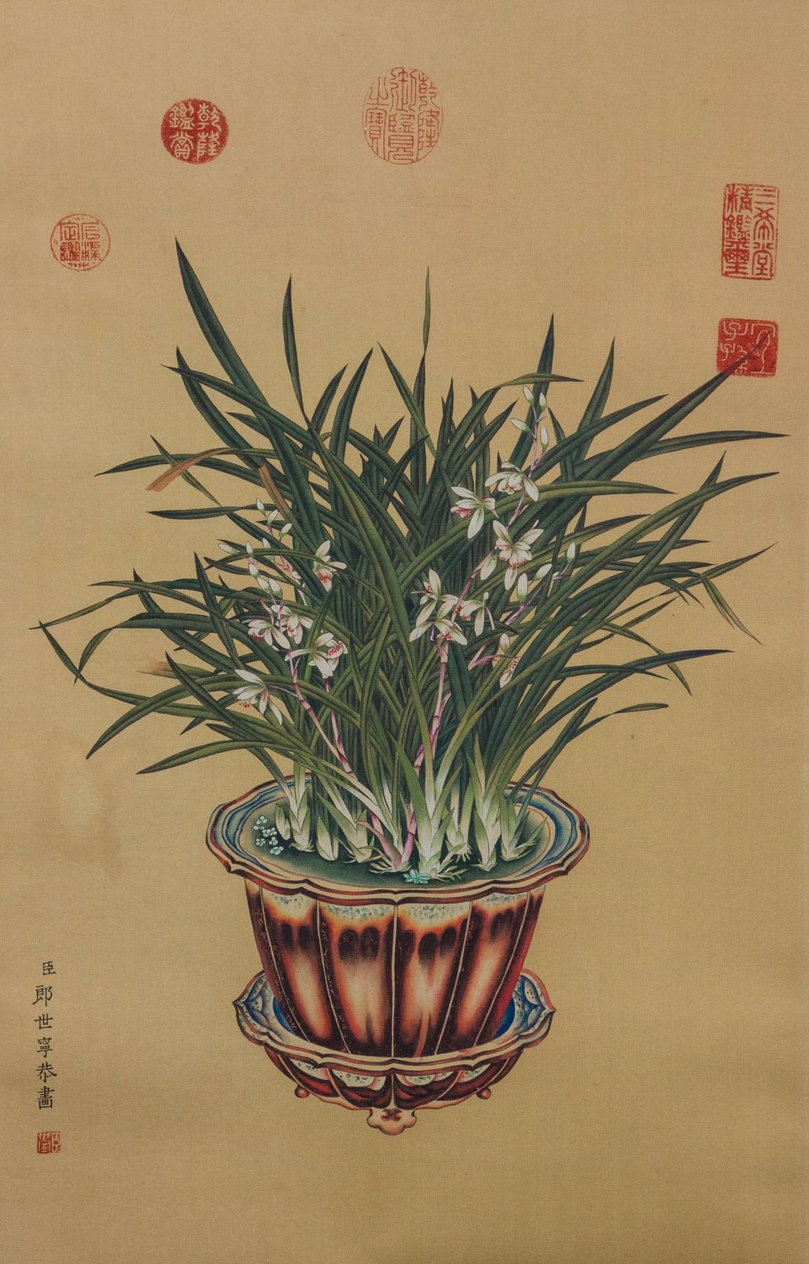 Painting of narcissus; Chinese ink and watercolour on silk; hanging scroll; signed Lang Shining (1688-1766); inscribed 1 artists seal and 5 imperial collector's seals; 55cm x 35cm