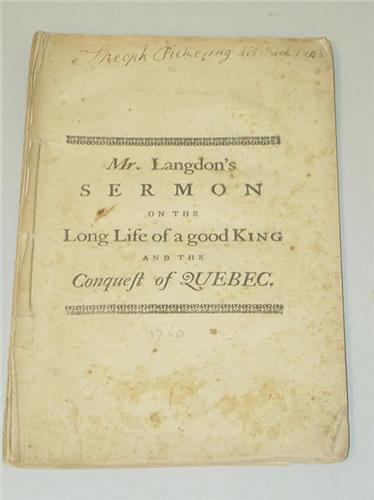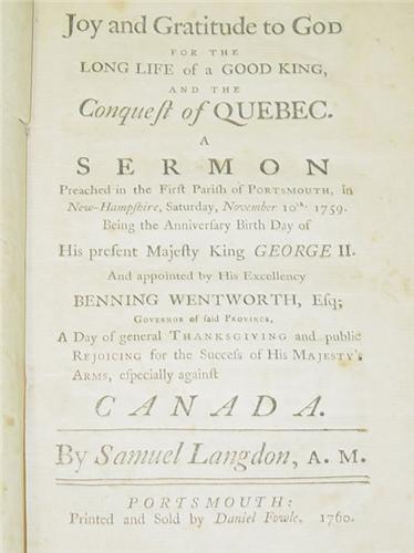 Langdon, Samuel. Joy and Gratitude to God for the Long Life of a Good King, and the Conquest of Quebec. A Sermon Preached in the First Parish of Portsmouth, in New-Hampshire, Saturday November 10th, 1759.. Portsmouth: Printed and Sold By Daniel Fowle, 1760. 8vo - over 7¾" - 9¾" tall. Soft Cover. Fair condition. THIS IS NOT AN EX-LIBRARY BOOK. 47pp, no boards, single thread stitched, corner curl, foxing. In a protective mylar cover. RARE & SCARCE.