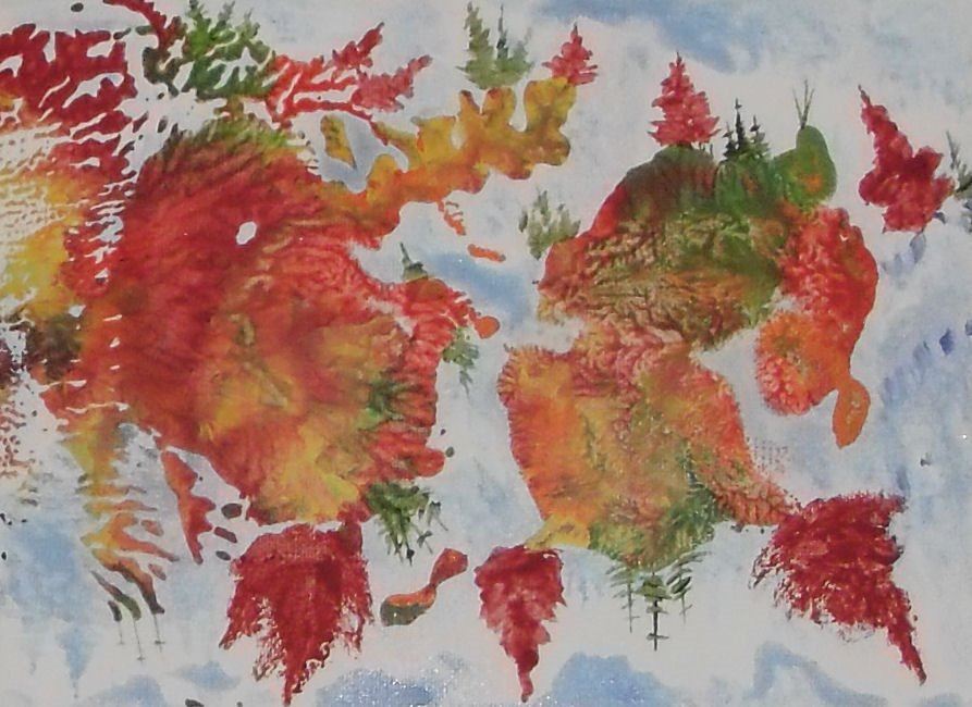 Arbres et iles rouges, an Artiste Langdonart original painting on canvas 9 x 7 inches plus frame 12 1/4 x 10 1/4 ; work of art accenting the red of the trees as well of the islands, where tempest predominatres; April 18 to May 8th 2016 exhibition at Galerie2456, at 2456 rue Beaubien Est (2 left of Cinema Beaubien, facing Molson Park) in Montreal, Quebec, Canada, bienvenue, that's welcome from 10 mornings to 10 nights every day except may 8th closing early before 4 p.m.; Langdonart paintings were in expositions in France this year in a museum; also in a museum last year elsewhere in Europe; Langdonart expositions have been for 60 years in numerous expositions in art galleries, art centres, museums in New York City, Los Angeles, Chicago, San Francisco, Fort Lauderdale, Vermont; Toronto, Montreal; Paris as well at many other cities in Belgium, Spain, Holland, Italy (Vatican art gallery)...; this is one view, see also ANOTHER landscape (3 of them) in a next number;