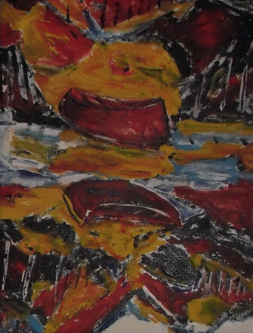 'Canot', an LangdonArt original collectible painting on canvas 16 high high by 12 inches; peinture originale creee par Artiste LangdonArt, sur toile; an original painting on canvas created by LangdonArt; for your collection or start one now for beauty of life and home or give as a great all-time wonderful gift this LangdonArt work of art; April 18 to May 8th 2016 exhibition at Galerie2456, at 2456 rue Beaubien Est (2 left of Cinema Beaubien, facing Molson Park) in Montreal, Quebec, Canada, bienvenue, that's welcome from 10 mornings to 10 nights every day except may 8th closing early before 4 p.m.; Langdonart paintings were in expositions in France this year in a museum; also in a museum last year elsewhere in Europe; Langdonart expositions have been for 60 years in numerous expositions in art galleries, art centres, museums in New York City, Los Angeles, Chicago, San Francisco, Fort Lauderdale, Vermont; Toronto, Montreal; Paris as well at many other cities in Belgium, Spain, Holland, Italy (Vatican art gallery)...; this is one view, see also ANOTHER landscape in the previous number;