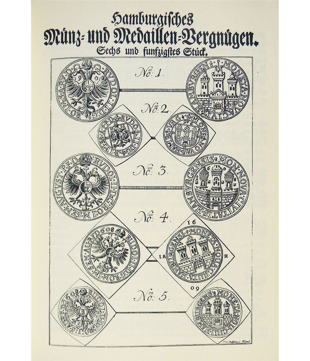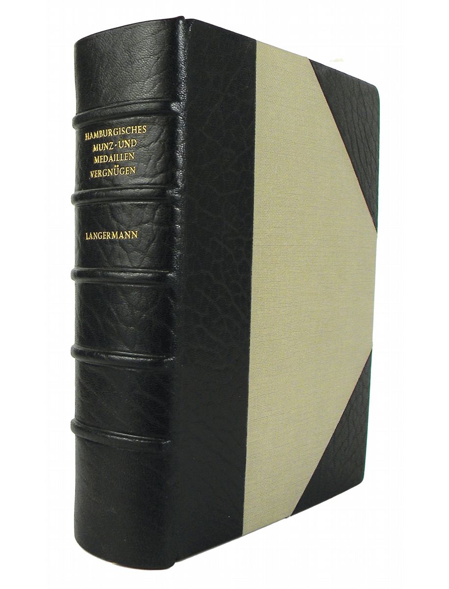 (Langermann, Joh. Paul). HAMBURGISCHES MÜNZ- UND MEDAILLEN-VERGNÜGEN ODER ABBILDUNG UND BESCHREIBUNG HAMBURGISCHER MÜNZEN UND MEDAILLEN... Hamburg, 1975 Tietjen reprint. Thick 8vo, superbly bound by Sangorski & Sutcliffe in black levant three-quarter morocco; spine with five raised bands, lettered in gilt; marbled endpapers; top page edges gilt; silk headbands. (98), 640, (24) pages; 80 plates of coins and medals. Very fine. A great classic work. No. 23 of only 100 copies reprinted.
