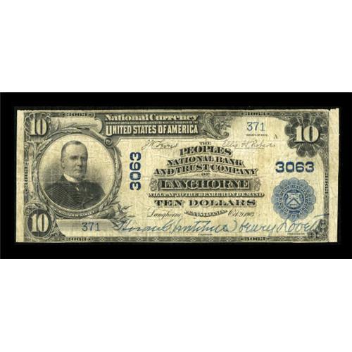 <B>Langhorne, PA</B></I> - $10 1902 Plain Back Fr. 624 <B>The Peoples NB & TC</B></I> Ch. # 3063<BR> Last appearing in our 2006 FUN auction where the description read, "A very scarce note from the only bank to issue in this Bucks County community. It's the only large example recorded in the census with the second title used here, and our guess is that not many more will ever turn up, as only 72 sheets were issued bearing this nomenclature from a bank that had but $940 outstanding in large size by 1935. <B>About Fine</B></I>, easily rare enough to reach or exceed..." It realized $3450 on an estimate of $2000 - $4000.<BR><BR><b>Shipping:</b> Coins & Currency (<a target="_blank" href="http://www.heritageauctions.com/common/shipping.php">view shipping information</a>)