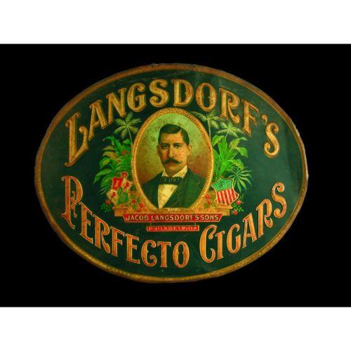 Langsdofs Perfecto Cigars Self Framed Tin Sign, dents on the edges and rust throughout fair condition, 20 x 16 inches.