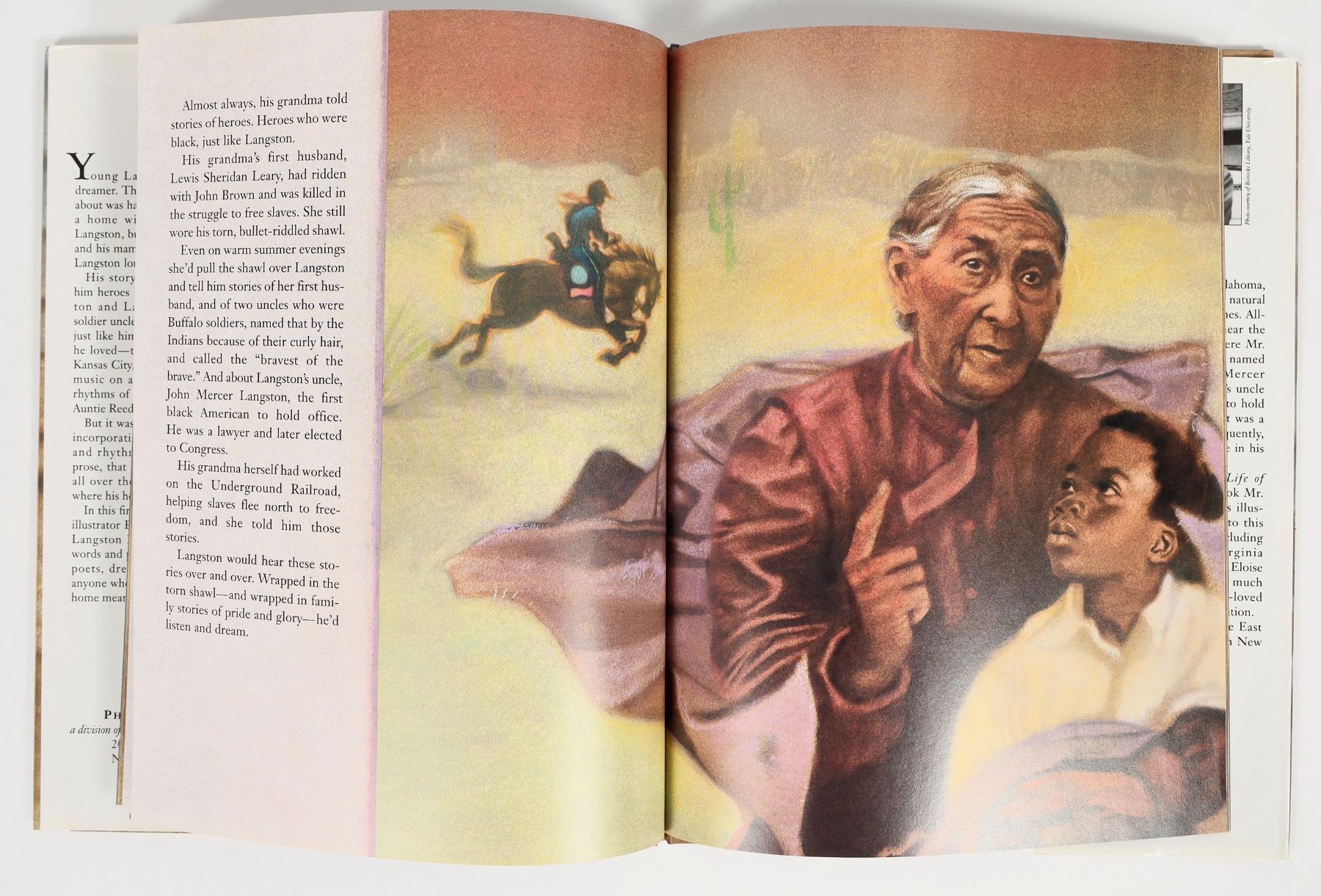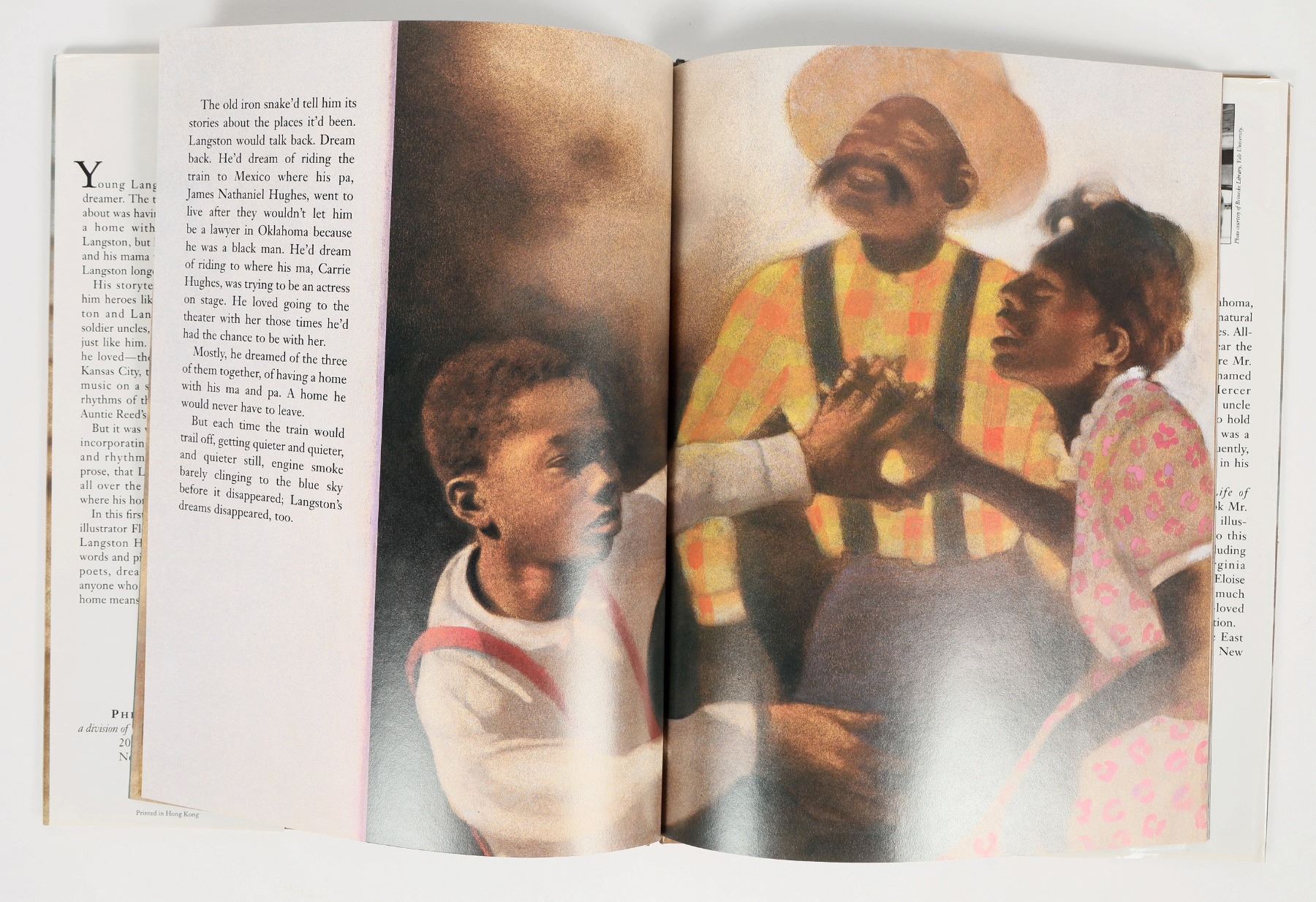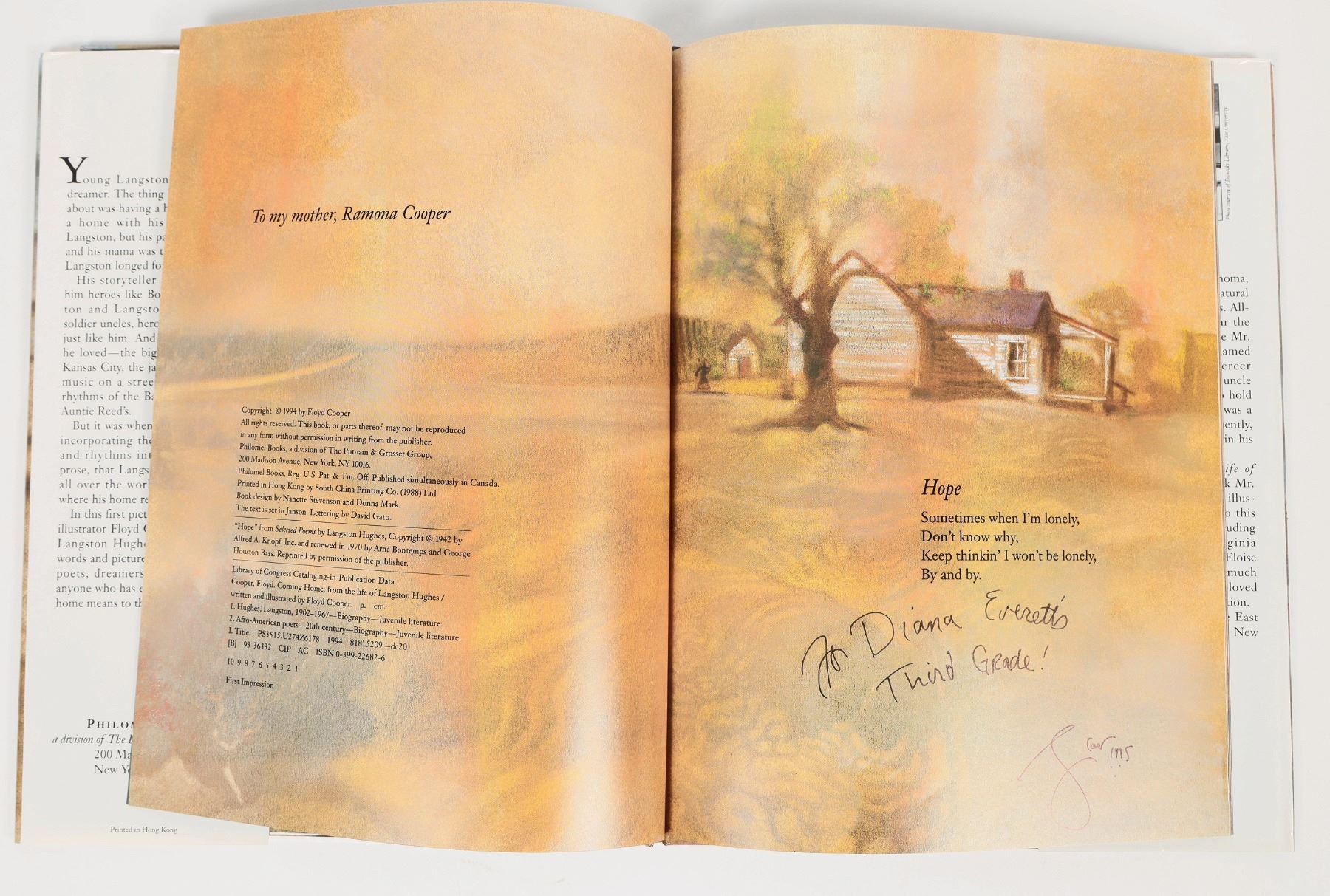 "Coming Home, from the life of Langston Hughes", by Floyd Cooper. Signed "For Diana Everett's Third Grade" by an illegible signer. Hardcover in good condition, paper sleeve with an incomplete tear. measures 9x11.2". See photo.
