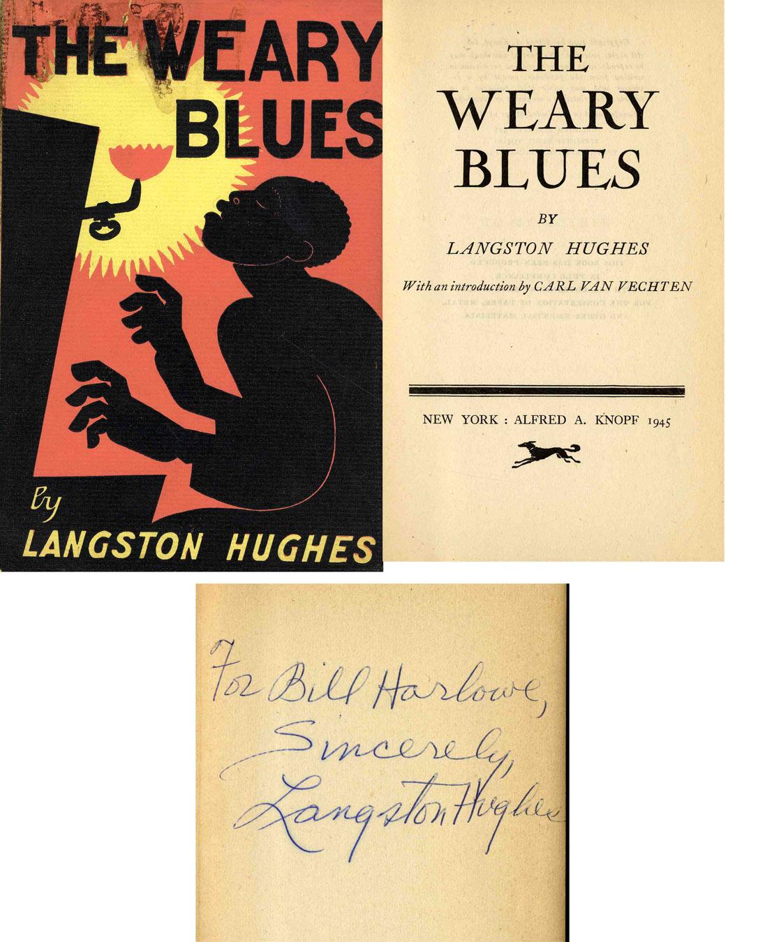 Langston Hughes signed copy of his first book of poetry, ''The Weary Blues.'' Publisher Alfred A. Knopf: New York: 1945. Slim 109pp. volume features Hughes' iconic poem ''The Negro Speaks of Rivers'' and others. Large inscription reads, ''For Bill Harlowe, Sincerely, Langston Hughes.'' Very good condition save for a dark stain to upper portion of book and spine affecting boards and dustjacket. Price-clipped jacket also has 1'' closed tear to top and 3'' split along spine. Book measures 5'' x 7.5''.