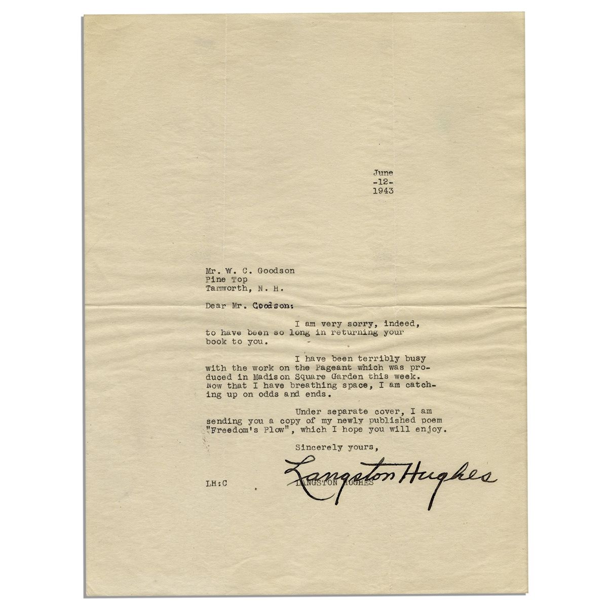 Langston Hughes typed letter signed. Dated 12 June 1943, letter to one Mr. W.C. Goodson reads in part, ''...I am very sorry, indeed, to have been so long in returning your book to you. I have been terribly busy with the work on the Pageant which was produced in Madison Square Garden this week. Now that I have breathing space, I am catching up on odds and ends. Under separate cover, I am sending you a copy of my newly published poem 'Freedom's Plow', which I hope you will enjoy. Sincerely yours, Langston Hughes''. Single-page letter on plain stationery measures 8.5'' x 11''. Toning and light rippling, else near fine.