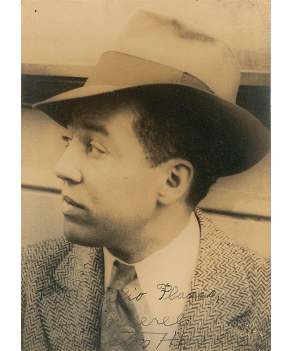 American writer (1902–1967) best known for such works as Weary Blues and The Ways of White Folks. Vintage matte-finish 5 x 7 Carl Van Vechten photo of Hughes in profile, signed and inscribed in fountain pen, “For Virgilio Planas, Sincerely, Langston Hughes.” Photo is affixed to a slightly larger mount. Light to moderate contrast to portions of signature and inscription, and a couple of light corner creases, otherwise fine condition.