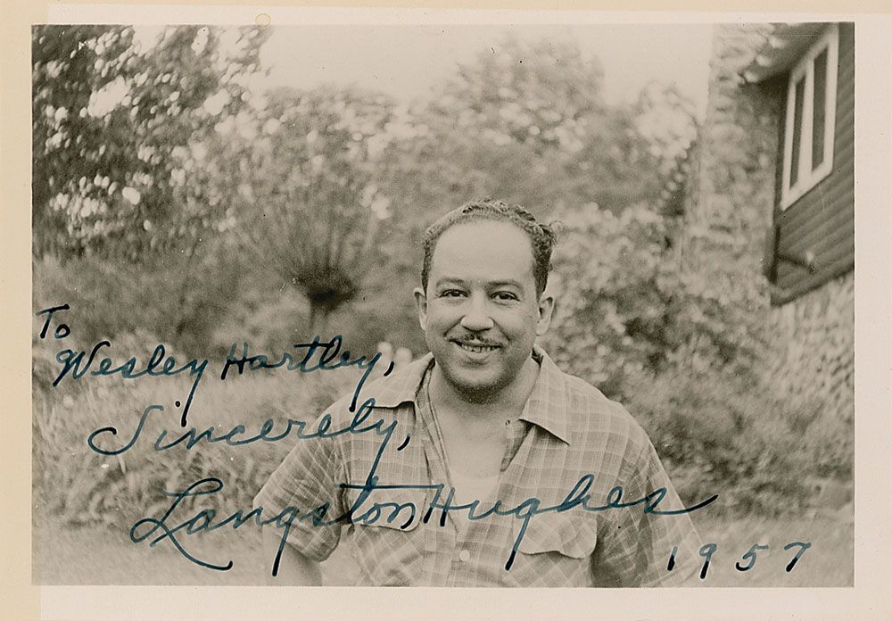 Vintage glossy 7 x 5 photo of Hughes posing outdoors, signed and inscribed in fountain pen, “To Wesley Hartley, Sincerely, Langston Hughes 1957.” In fine condition, with some mild border toning.