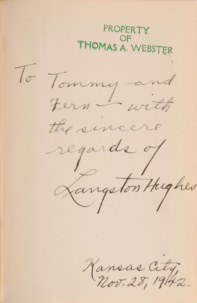 Signed book: The Weary Blues. Later printing. NY: Alfred A. Knopf, 1939. Hardcover with dust jacket, 5.25 x 7.75, 109 pages. Signed and inscribed on the first free end page in fountain pen, "To Tommy and Fern-with the sincere regards of Langston Hughes, Kansas City, Nov. 28, 1942." Autographic condition: fine, with ownership stamp to signed page. Book condition: VG/VG-.