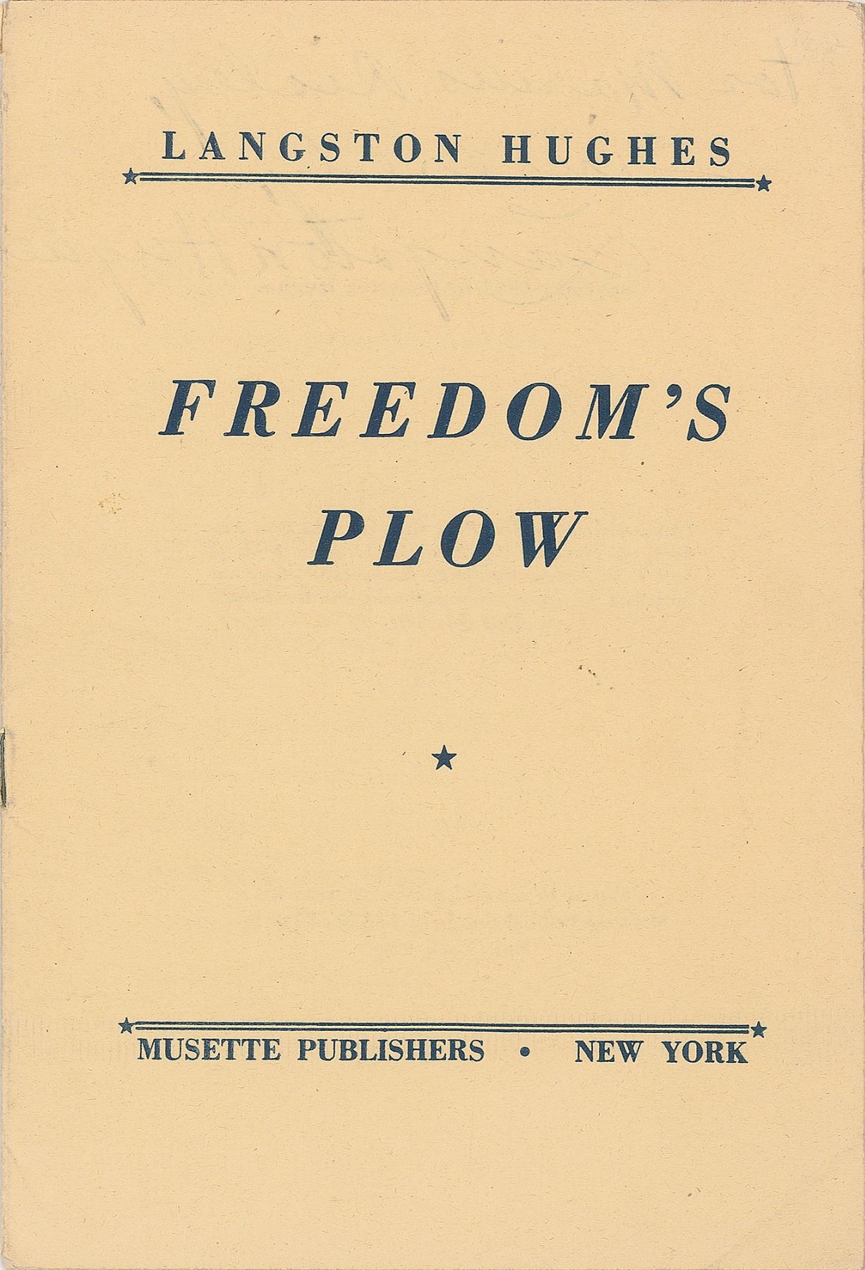 Scarce booklet for the Langston Hughes poem "Freedom's Plow," published by Musette Publishers of New York in 1943, fourteen pages, 5.25 x 7.75, signed and inscribed on the copyright page in fountain pen, "For Marius Risley, Sincerely, Langston Hughes." In fine condition, with the cover detached from the inner pages.
