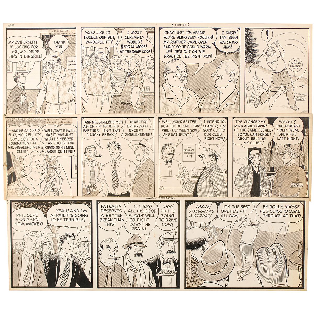 Three original hand-inked Mickey Finn daily comic strips, all measuring approximately 17 x 5.25, all having golf-related content. Each signed in one of the panels by Leonard. In very good condition, with scattered toning and soiling.