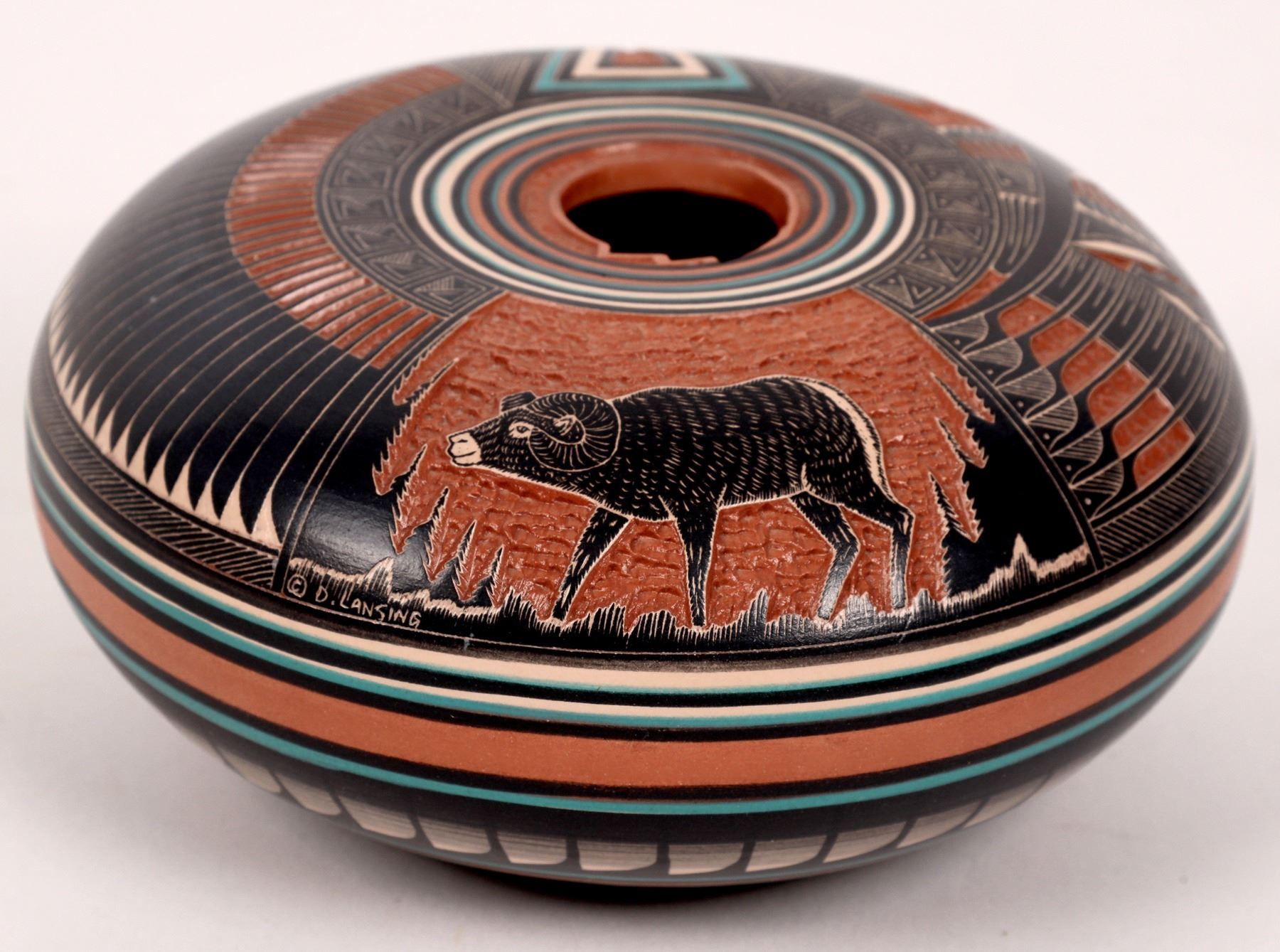 Sgrafitto pot etched with feather and ram design; black and turquoise on red clay seed Jar. Signed by Doreen Lansing and husband Roger Nelson. This seed pot features a complex feathery geometric design surrounding the ram. 2.75" x 5".