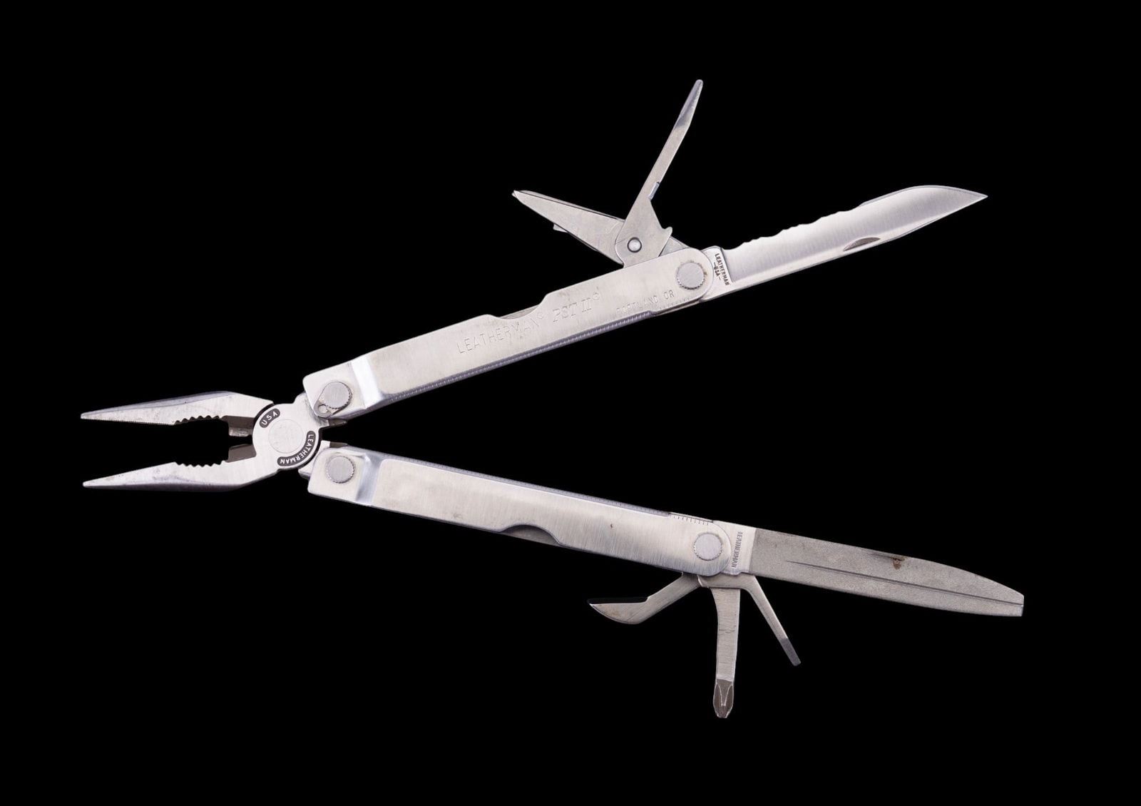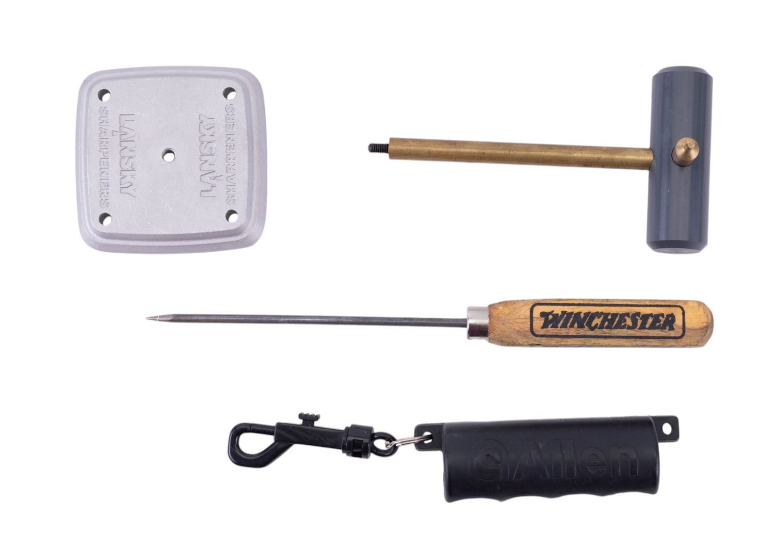 Lansky Sharpeners 35 Years knife sharpening kit w/ all pieces & instructions, Lansky Sharpeners universal mount, 15-piece hammer & punch set, army green folding bow hanger, Leatherman PST II multi tool w/ textile case, Gunslick gun cleaning kit in textile case, 3 MTM Case-Gard choke tube sets + extra empty case, Winchester ice pick, Allen silicon archery arrow puller, & 2 other tools.