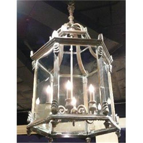 This is a fabulous lantern chandelier ceiling fixture with six candlestick lights and a wonderfu verdigris patina. It is wired to USA code and makes a stiking addition to any setting.