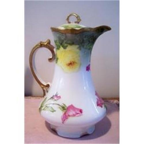 <tr><td>Title:Lanternier Limoges Chocolate Pot - Roses - Gold</td></tr>