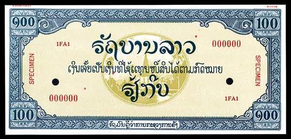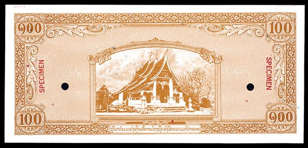1948. P-Unlisted. 100 Kip. Essay trial color specimen banknote for proposed and unaccepted banknote issue from Laos. Grey-green borders & orange-yellow Temple undertint on front; back has temple in blue. Dated 3-10-48 in red on right and numbered C2003-100M in red on upper left. Red specimen overprint, "00000" serial numbers and POC's. Choice uncirculated condition. Unique color trial in archive. SBNC.