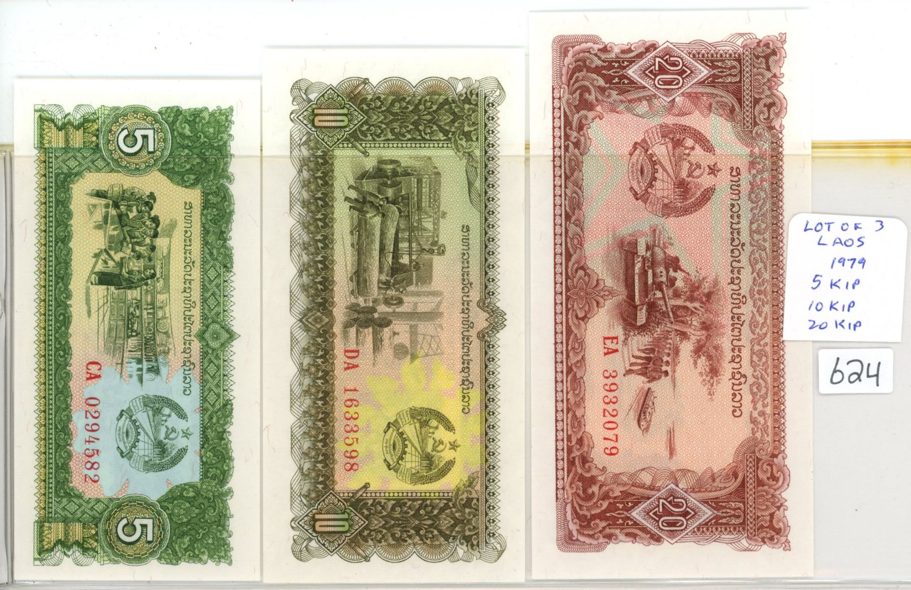 Laos. Lot of 3 notes issued in 1979 by the Bank of the Lao PDR. Includes 5 Kip, 10 Kip & 20 Kip. Uncirculated.