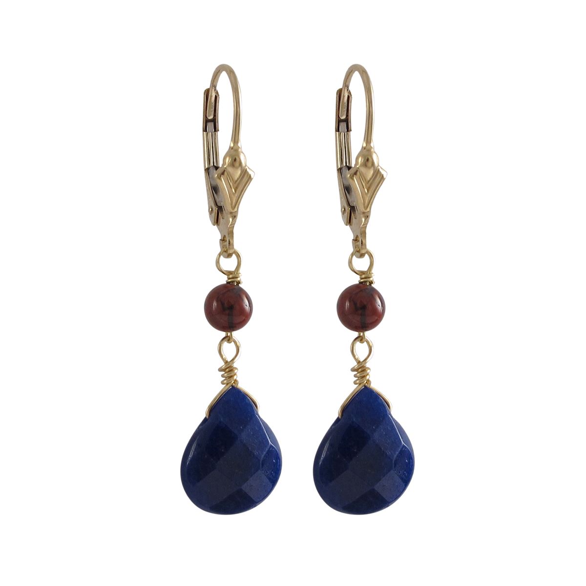 Lapis 9.5X11mm Teardrop And Poppy Jasper 4Mm Ball Semi Precious Stones On Gold Filled Lever Back Earrings, 1.54"