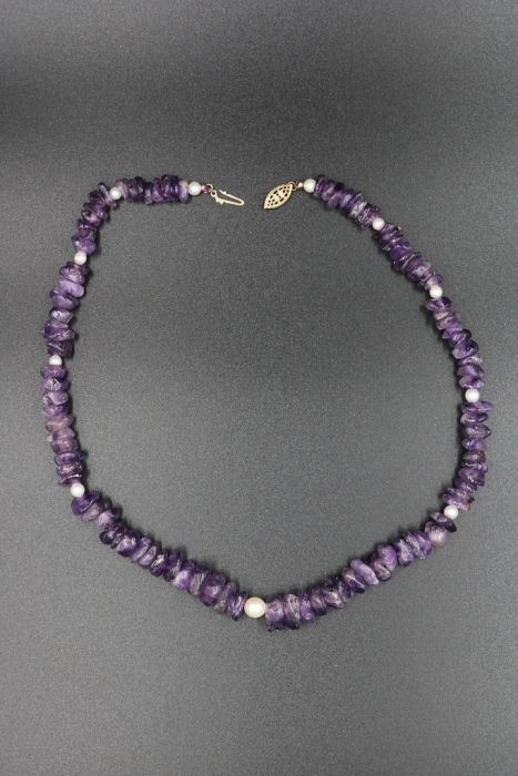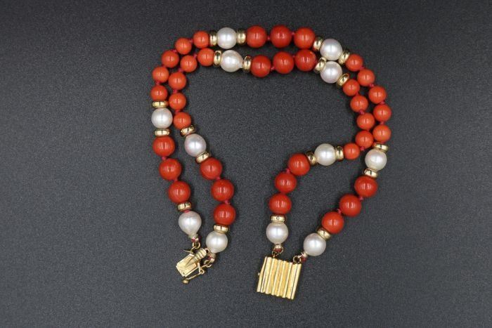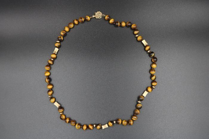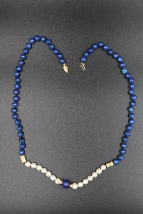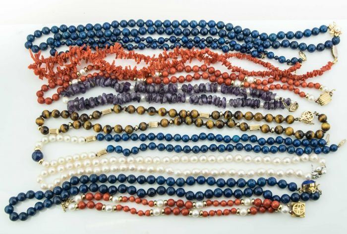 14K yellow gold clasp; 64 8mm Beads; 1 Bead 12.5x10.5mm ; 32.6 dwt; 22.5" long (2) Tiger Eye 22"; (3) Lapis, 24"; (4) Amethyst/Pear, 17":(5) Coral 23 1/2"; (6) Pearl & Coral, 8 1/2": (7) Blue Lapis & Pearl 22": (8) Lapis Lazuli 19".