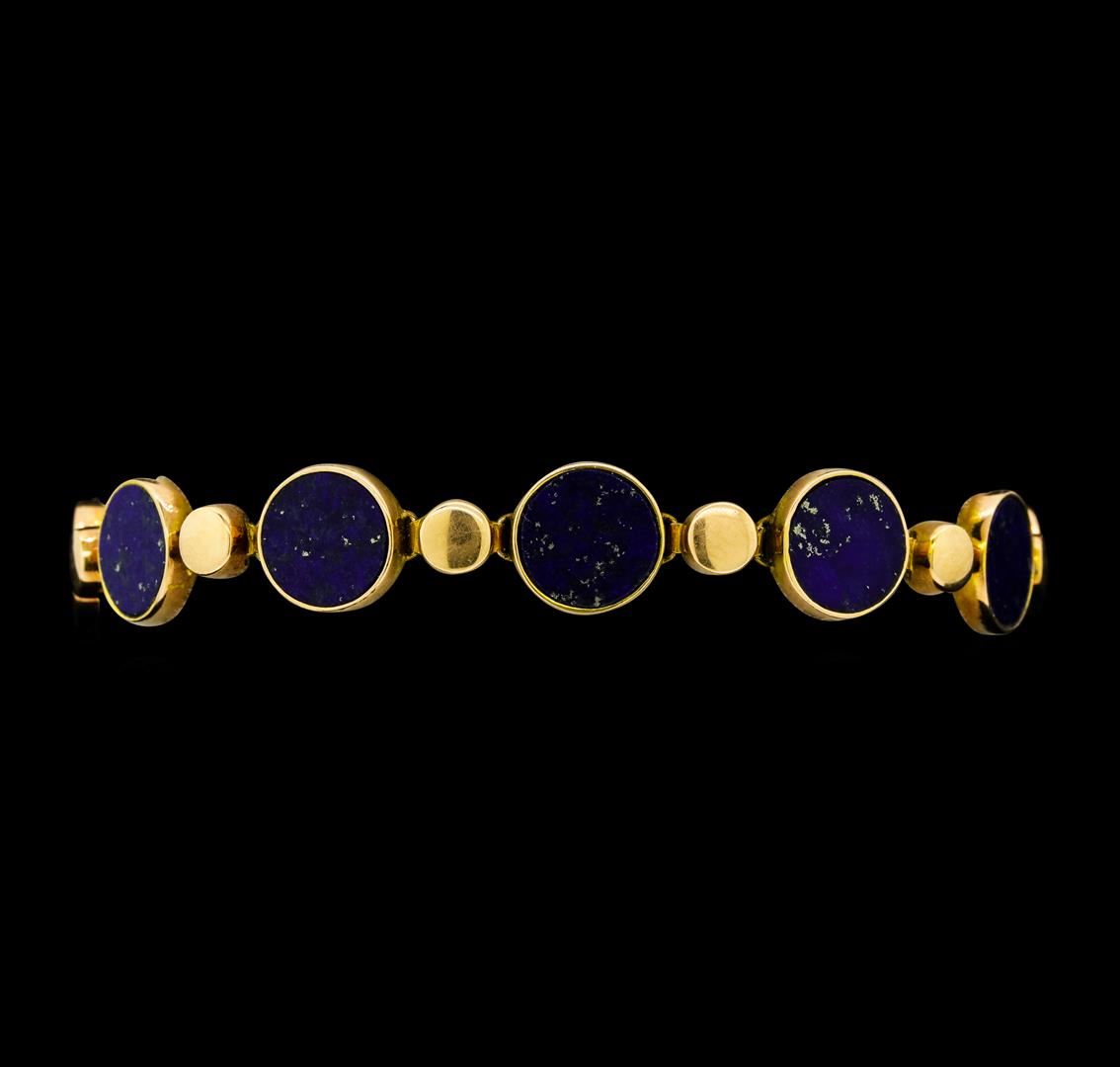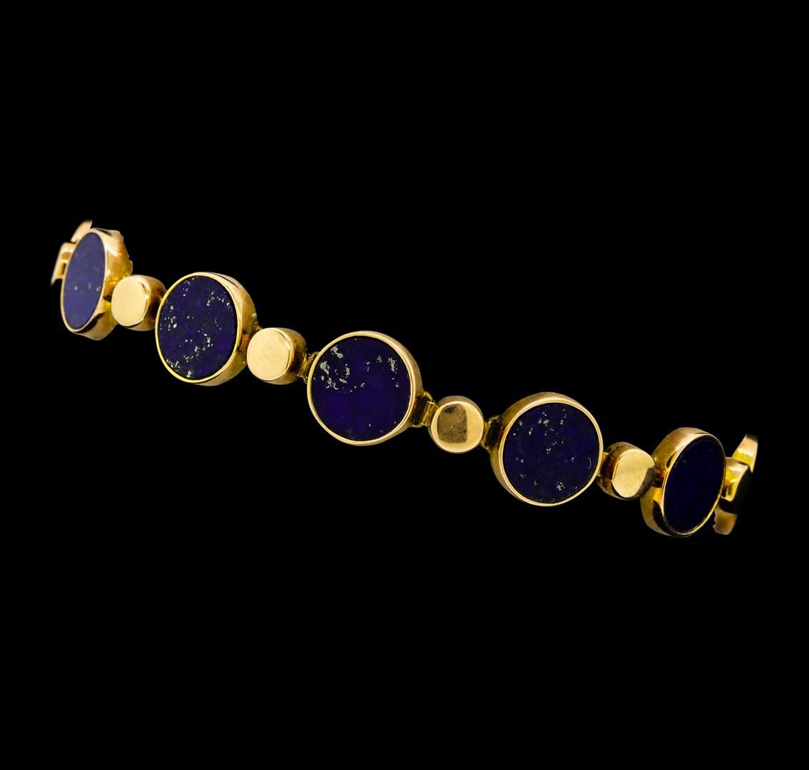 One lady's bracelet featuring: 14KT rose gold weighing 10.7 grams containing eleven circular pieces of Lapis Lazuli. The bracelet measures approximately seven inches in length.