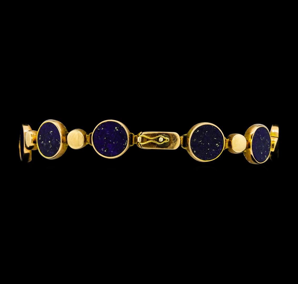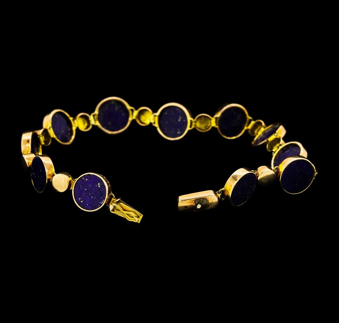 One lady's bracelet featuring: 14KT rose gold weighing 10.7 grams containing eleven circular pieces of Lapis Lazuli. The bracelet measures approximately seven inches in length.