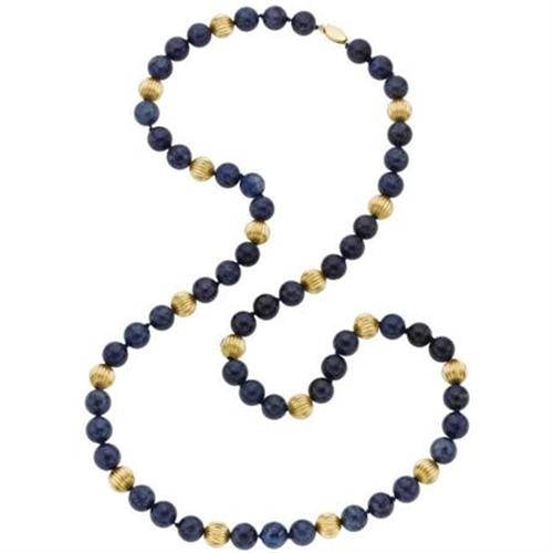 <B>Lapis Lazuli, Gold Bead, Gold Necklace</B></I><BR><BR>The necklace is composed of round lapis lazuli beads, alternating with 14k yellow gold corrugated beads, forming a single knotted strand, completed by a 14k yellow gold clasp. Gross weight 92.20 grams. <BR><I>Length: 30 inches</B></I> <B>Condition Report:</B> Good condition.<BR>Needs restringing.<BR><BR><b>Shipping:</b> Miscellaneous Collectibles, Smal (<a target="_blank" href="http://www.heritageauctions.com/common/shipping.php">view shipping information</a>)