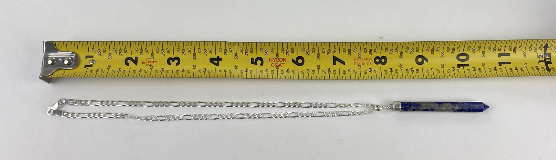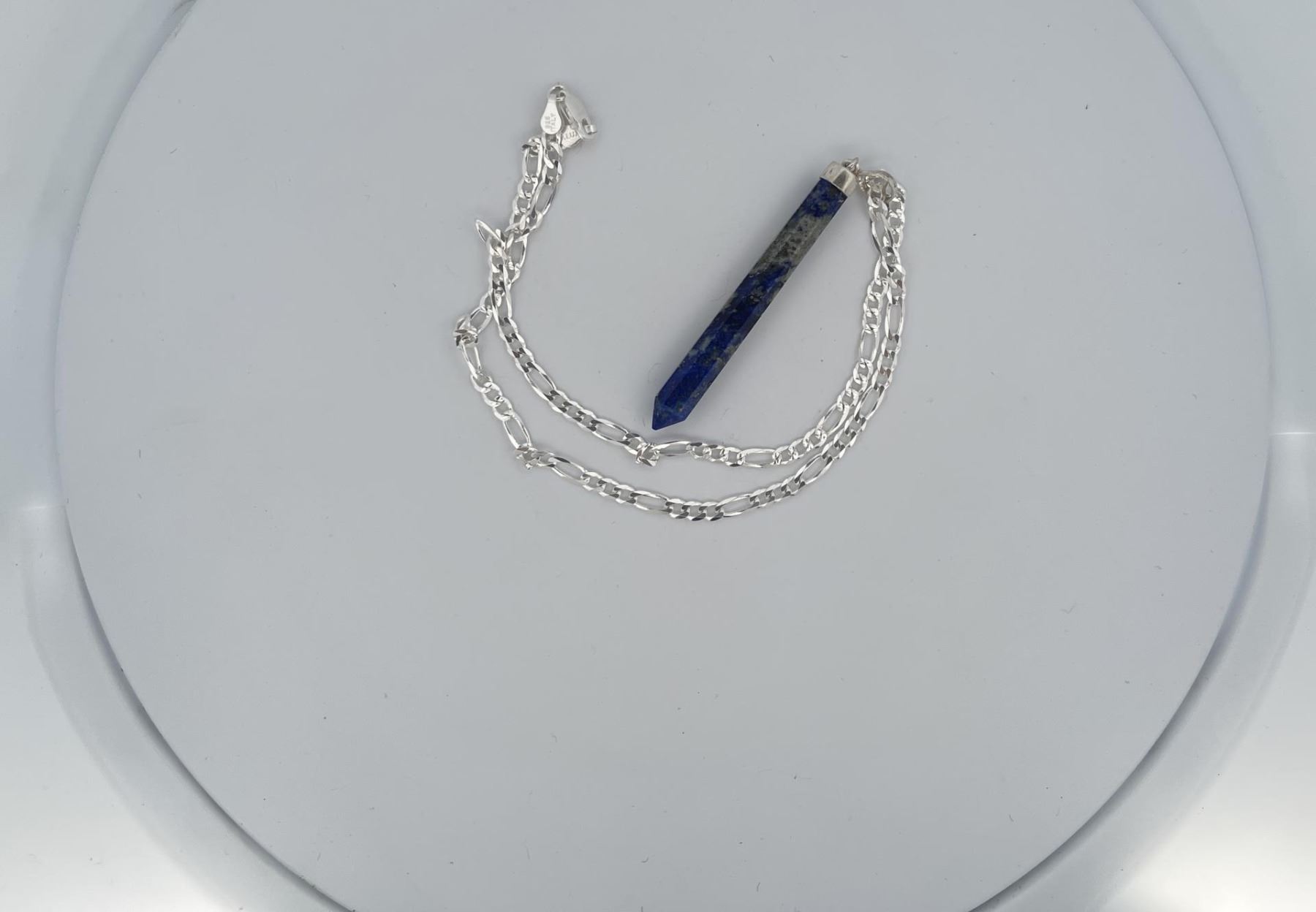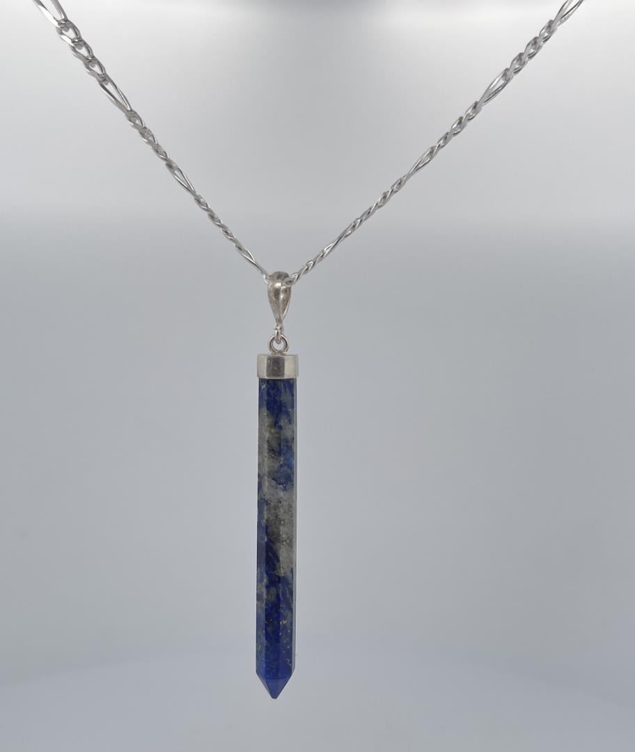 Material is Lapis Lazuli. Set in Sterling Silver, with a Sterling Silver chain.
