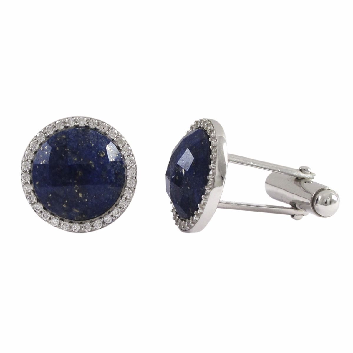 Lapis Semi Precious Faceted Stone With CZ Border, Rhodium Plated Sterling Silver, 15Mm Round Cufflin
