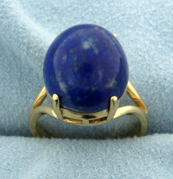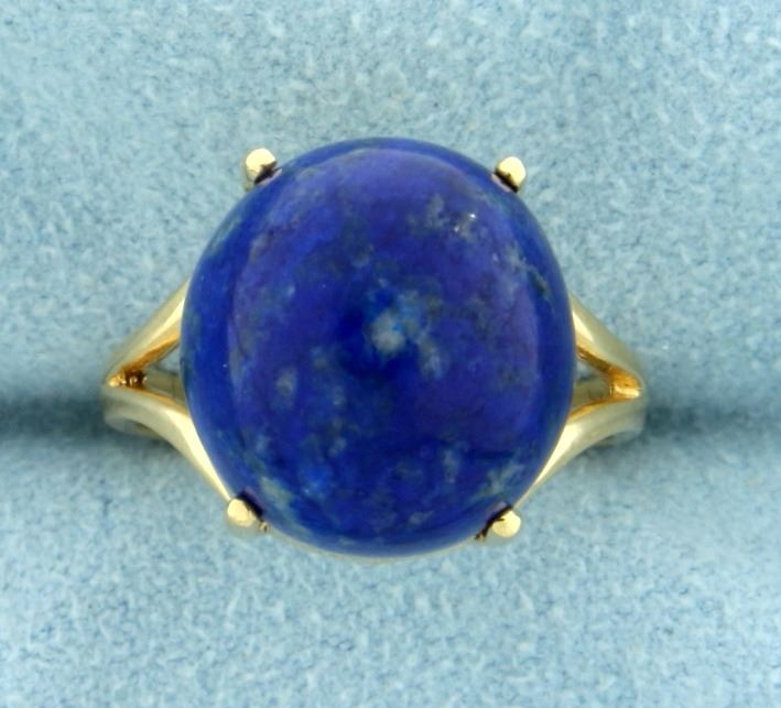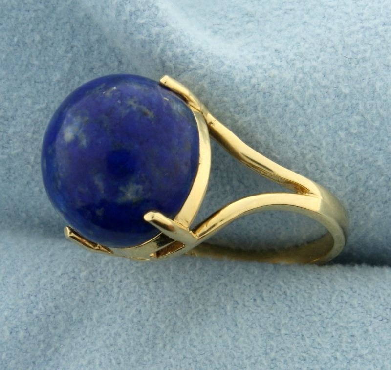In 14k yellow gold. Contains a large 13mm Cabochon cut Natural Lapis Gemstone with bright blue color. Size 6 1/4. 6.2g.