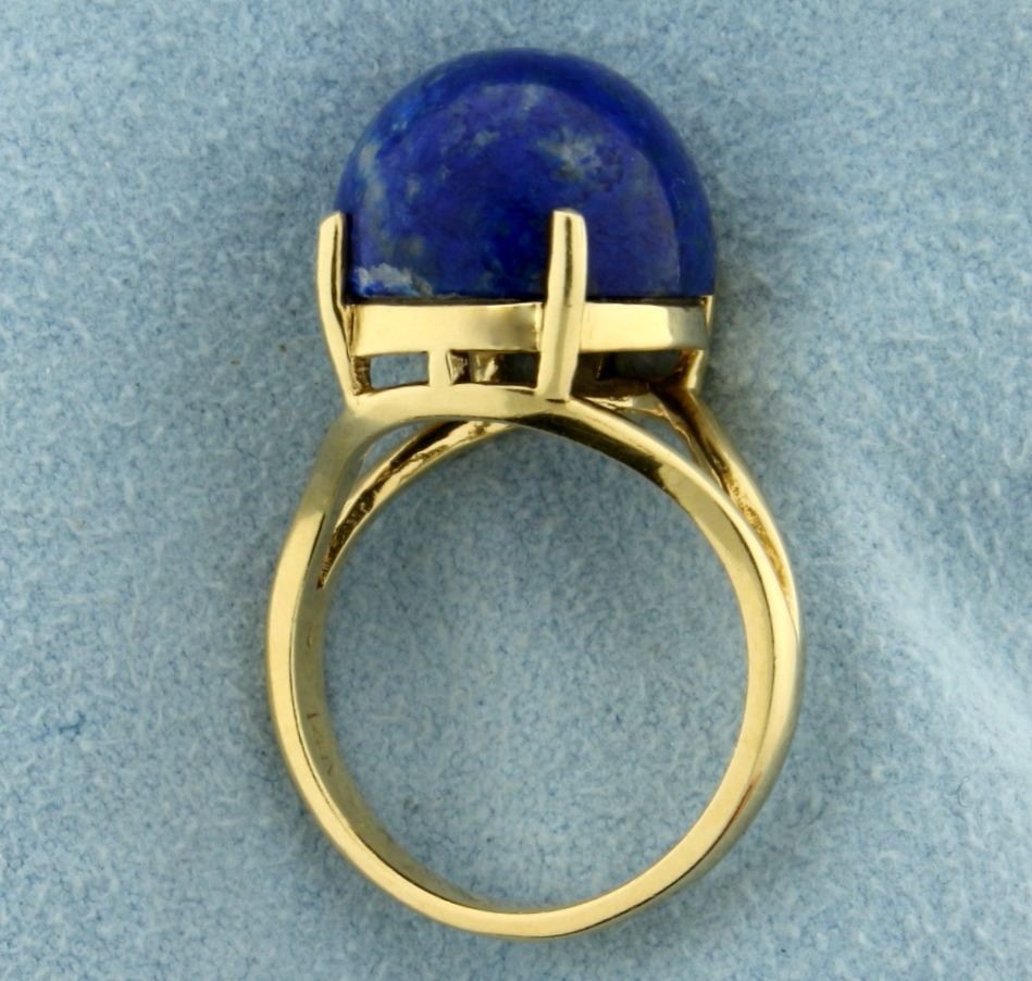 In 14k yellow gold. Contains a large 13mm Cabochon cut Natural Lapis Gemstone with bright blue color. Size 6 1/4. 6.2g.