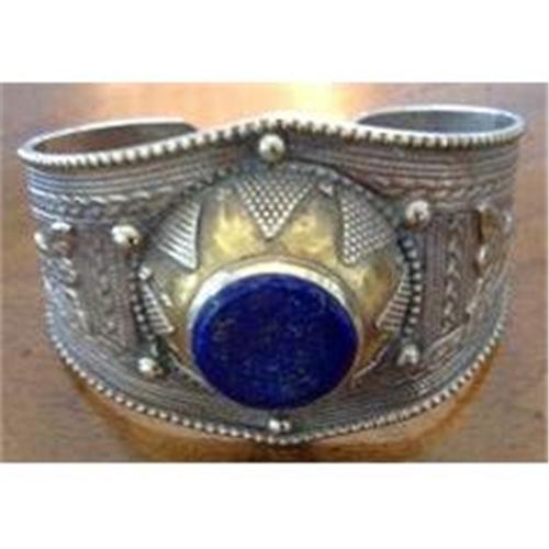 This is a very old sterling and gold washed cuff bracelet with a center Lapis Lazuli stone and tremendous repose decoration; the most interesting being the Phoenix on each side. This piece was found in the Middle East. Approximately 2" wide